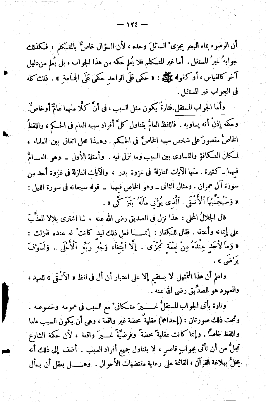 وأما الجواب المستقل: فتارة يكون مثل السبب في أن كلا منهما عام أو خاص. وحكمه إذن أنه يساويه. فاللفظ العام يتناول كل أفراد سببه العام في الحكم واللفظ الخاص مقصور على شخص سببه الخاص في الحكم. وهذا محل اتفاق بين العلماء لمكان التكافؤ والتساوي بين السبب وما نزل فيه. وأمثلة الأول- وهو العام فيهما- كثيرة. منها الآيات النازلة في غزوة بدر والآيات النازلة في غزوة أحد من سورة آل عمران.