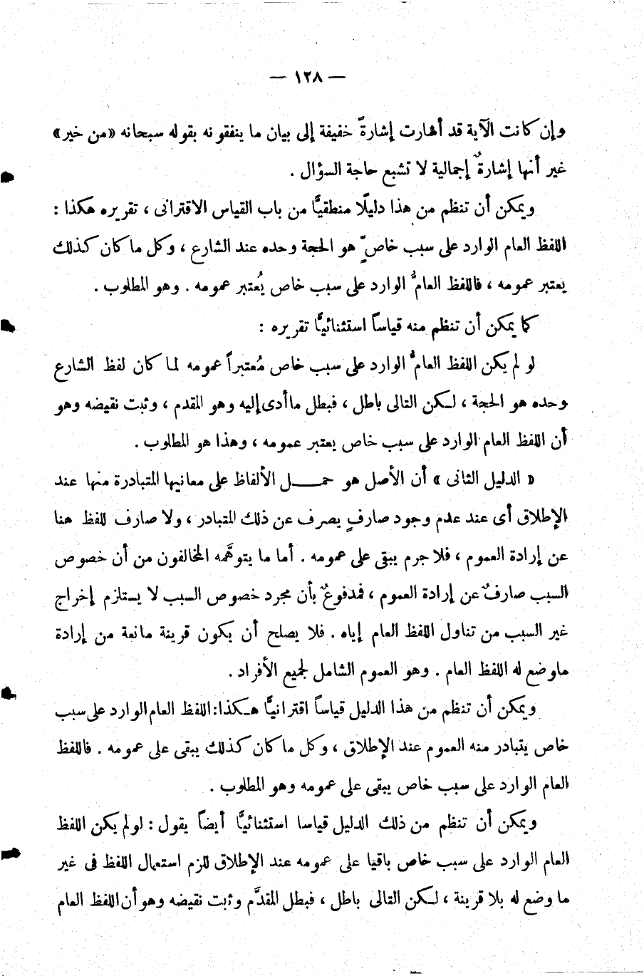 ويمكن أن تنظم من هذا الدليل قياسا اقترانيا هكذا: اللفظ العام الوارد على سبب خاص يتبادر منه العموم عند الإطلاق وكل ما كان كذلك يبقى على عمومه. فاللفظ العام الوارد على سبب خاص يبقى على عمومه وهو المطلوب.