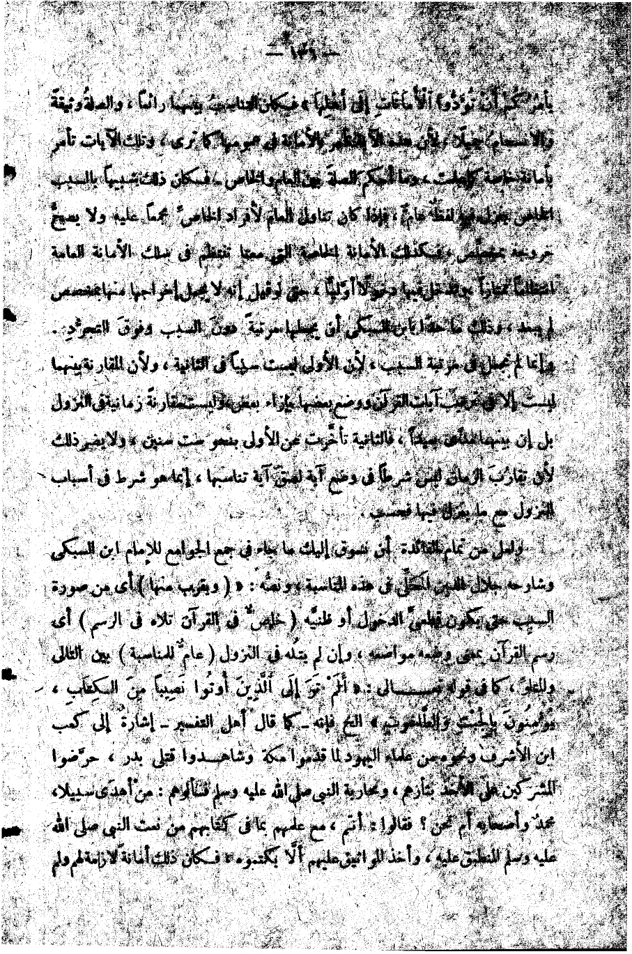 ولعل من تمام الفائدة أن نسوق إليك ما جاء في جمع الجوامع للإمام ابن السبكي وشارحه جلال الدين المحلي في هذه المناسبة ونصه: ويقرب منها أي من صورة السبب حتى يكون قطعي الدخول أو ظنيه خاص في القرآن تلاه في الرسم أي رسم القرآن بمعنى وضعه مواضعه وإن لم يتله في النزول عام للمناسبة بين التالي والمتلو كما في قوله تعالى: {أَلَمْ تَرَ إِلَى الَّذِينَ أُوتُوا نَصِيباً مِنَ الْكِتَابِ يُؤْمِنُونَ بِالْجِبْتِ وَالطَّاغُوتِ} الخ فإنه -كما قال أهل التفسير- إشارة إلى كعب بن الأشرف ونحوه من علماء اليهود لما قدموا مكة وشاهدوا قتلى بدر حرضوا المشركين على الأخذ بثأرهم ومحاربة النبي صلى الله عليه وسلم فسألوهم: من أهدى سبيلا محمد وأصحابه أم نحن؟ فقالوا: أنتم مع علمهم بما في كتابهم من نعت النبي صلى الله عليه وسلم المنطبق عليه وأخذ المواثيق عليهم ألا يكتموه فكان ذلك أمانة لازمة لهم ولم