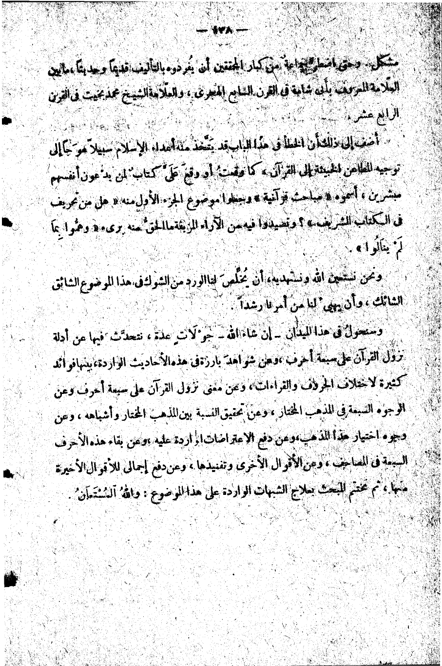 أضف إلى ذلك أن الخطأ في هذا الباب قد يتخذ منه أعداء الإسلام سبيلا عوجا إلى توجيه المطاعن الخبيثة إلى القرآن كما وقعت أو وقع علي كتاب لمن يدعون أنفسهم مبشرين أسموه مباحث قرآنية وجعلوا موضوع الجزء الأول منه هل من تحريف في الكتاب الشريف؟ وتصيدوا فيه من الآراء المزيفة ما الحق منه بريء {وَهَمُّوا بِمَا لَمْ يَنَالُوا} .