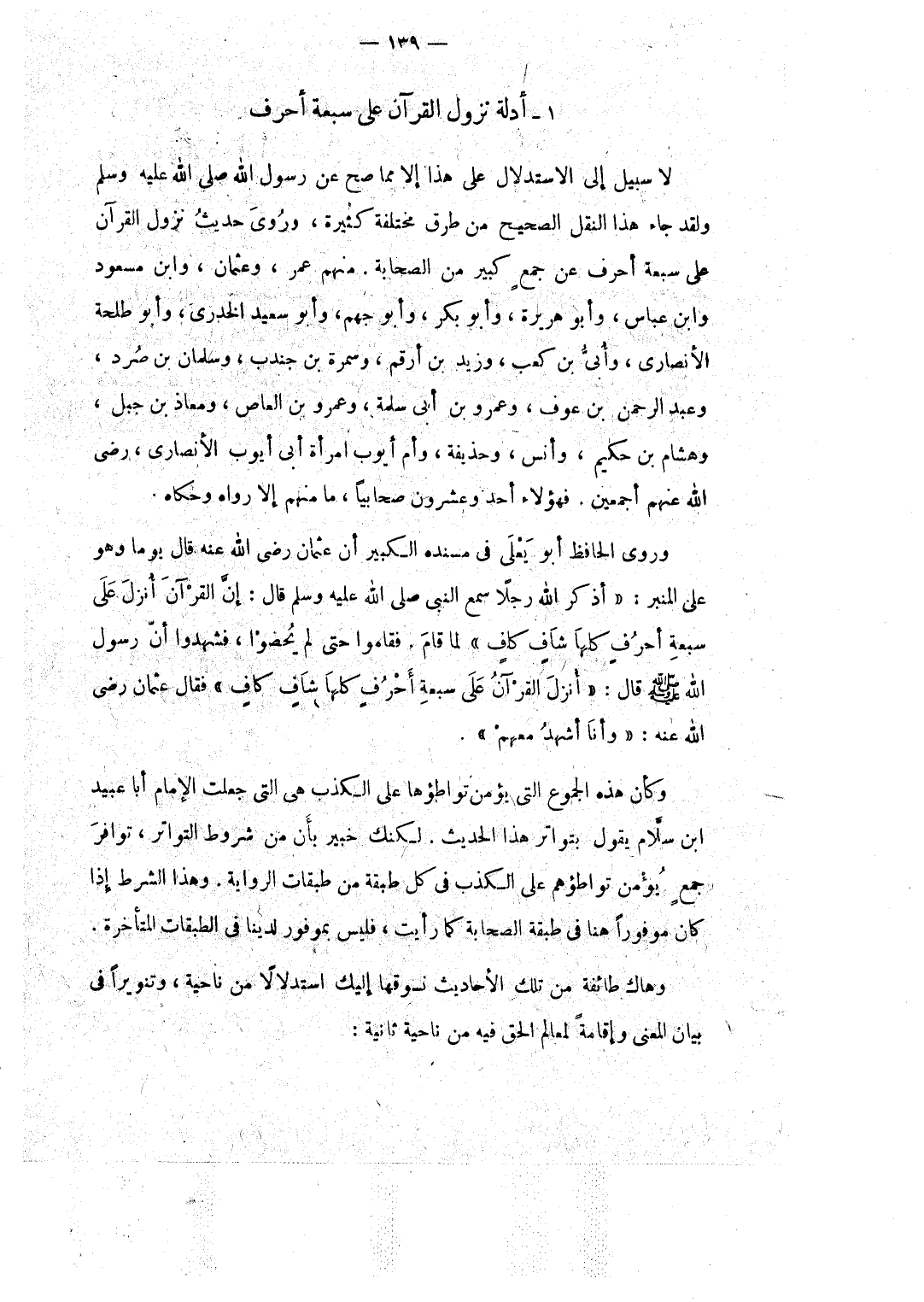 لا سبيل إلى الاستدلال على هذا إلا مما صح عن رسول الله صلى الله عليه وسلم ولقد جاء هذا النقل الصحيح من طرق مختلفة كثيرة وروي حديث نزول القرآن على سبعة أحرف عن جمع كبير من الصحابة.