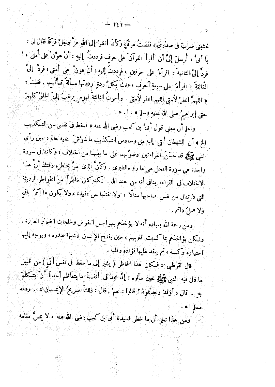 واعلم أن معنى قول أبي بن كعب رضي الله عنه فسقط في نفسي من التكذيب الخ أن الشيطان ألقى إليه من وساوس التكذيب ما شوش عليه حاله حين رأى النبي صلى الله عليه وسلم قد حسن القراءتين وصوبهما على ما بينهما من اختلاف وكانتا في سورة واحدة هي سورة النحل على ما رواه الطبري. وكأن الذي مر بخاطره وقتئذ أن هذا الاختلاف في القراءة ينافي أنه من عند الله. لكنه كان خاطرا من الخواطر الرديئة التي لا تنال من نفس صاحبها منالا ولا تفتنها عن عقيدة ولا يكون لها أثر باق ولا عمل دائم.