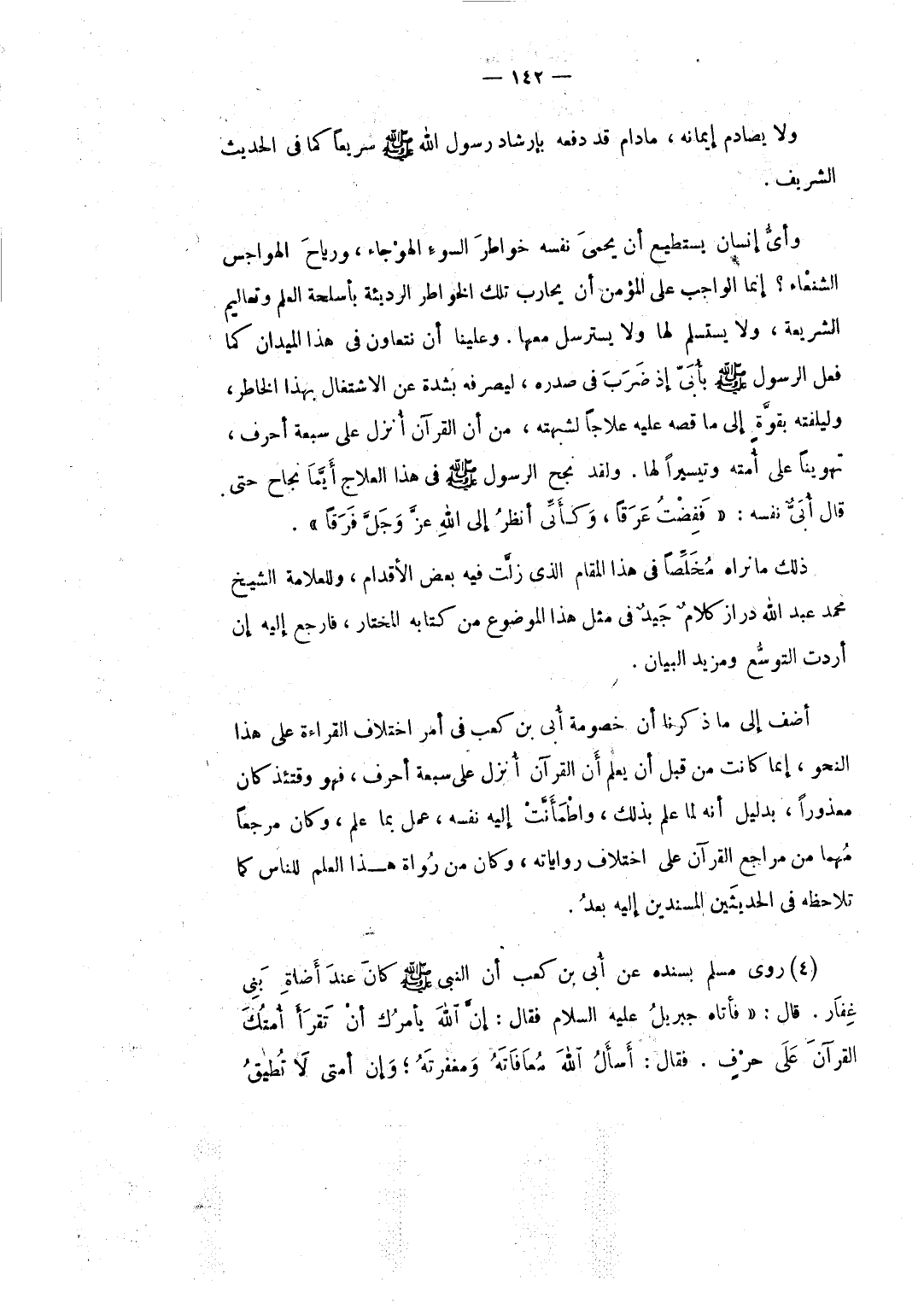 وأي إنسان يستطيع أن يحمي نفسه خواطر السوء الهوجاء ورياح الهواجس الشنعاء إنما الواجب على المؤمن أن يحارب تلك الخواطر الرديئة بأسلحة العلم وتعاليم الشريعة ولا يستسلم لها ولا يسترسل معها. وعلينا أن نتعاون في هذا الميدان كما فعل الرسول صلى الله عليه وسلم بأبي إذ ضرب في صدره ليصرفه بشدة عن الاشتغال بهذا الخاطر وليلفته بقوة إلى ما قصه عليه علاجا لشبهته من أن القرآن أنزل على سبعة أحرف تهوينا على أمته وتيسيرا لها. ولقد نجح الرسول صلى الله عليه وسلم في هذا العلاج أيما نجاح حتى قال أبي نفسه: ففضت عرقا وكأني أنظر إلى الله عز وجل فرقا.