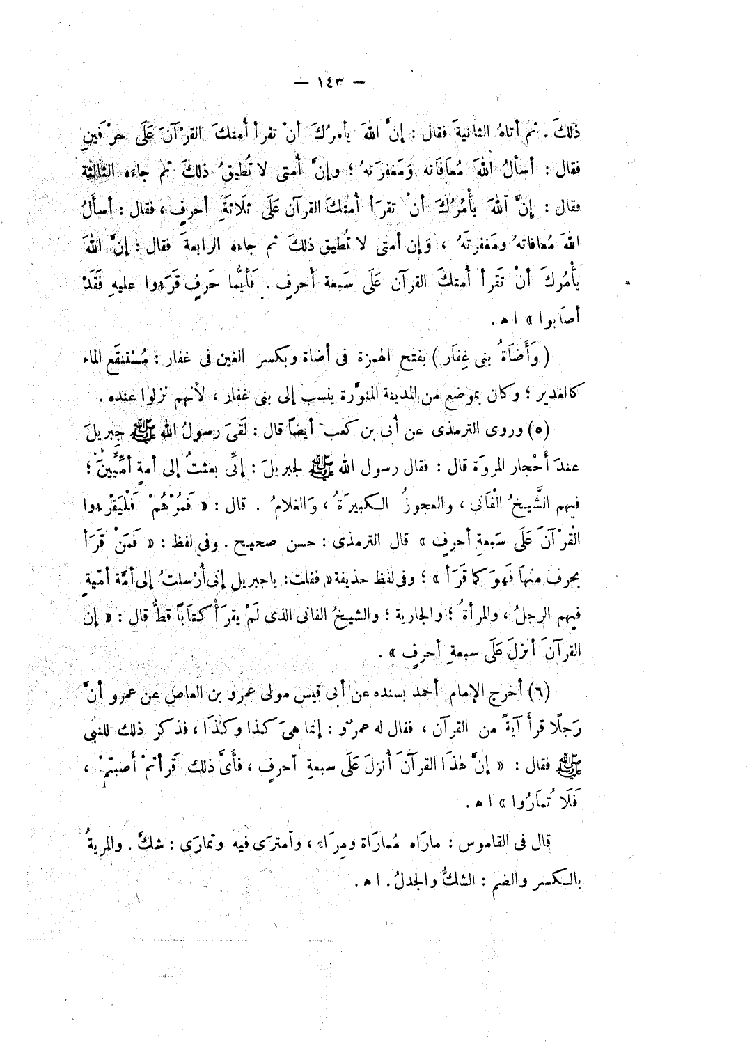 ذلك". ثم أتاه الثانية فقال: إن الله يأمرك أن تقرأ أمتك القرآن على حرفين فقال: "أسأل الله معافاته ومغفرته وإن أمتي لا تطيق ذلك" ثم جاءه الثالثة فقال: إن الله يأمرك أن تقرأ أمتك القرآن على ثلاثة أحرف فقال: "أسأل الله معافاته ومغفرته وإن أمتي لا تطيق ذلك" ثم جاءه الرابعة فقال: إن الله يأمرك أن تقرأ أمتك القرآن على سبعة أحرف. فأيما حرف قرؤوا عليه فقد أصابوا اهـ.