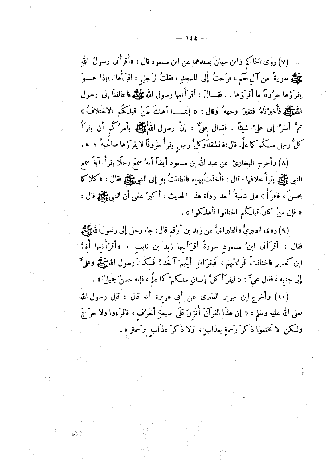 8- وأخرج البخاري عن عبد الله بن مسعود أيضا أنه سمع رجلا يقرأ آية سمع النبي صلى الله عليه وسلم يقرأ خلافها. قال: فأخذت بيده فانطلقت به إلى النبي صلى الله عليه وسلم فقال: "كلاكما محسن فاقرأ" قال شعبة أحد رواة هذا الحديث: أكبر علمي أن النبي صلى الله عليه وسلم قال: "فإن من كان قبلكم اختلفوا فأهلكوا".
