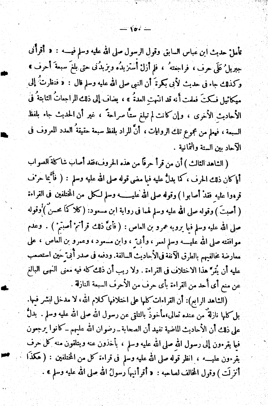 الشاهد الثالث: أن من قرأ حرفا من هذه الحروف فقد أصاب شاكلة الصواب أيا كان ذلك الحرف كما يدل عليه فيما مضى قوله صلى الله عليه وسلم: "فأيما حرف قرؤوا عليه فقد أصابوا" وقوله صلى الله عليه وسلم لكل من المختلفين في القراءة "أصبت" وقوله صلى الله عليه وسلم لهما في رواية ابن مسعود: "كلا كما محسن" وقوله صلى الله عليه وسلم فيما يرويه عمرو بن العاص: "فأي ذلك قرأتم أصبتم". وعدم موافقته صلى الله عليه وسلم لعمر وأبي وابن مسعود وعمرو بن العاص على معارضة مخالفيهم بالطرق الآنفة في الأحاديث السالفة. ودفعه في صدر أبي حين استصعب عليه أن يقر هذا الاختلاف في القراءة. ولا ريب أن ذلك كله فيه معنى النهي البالغ عن منع أي أحد من القراءة بأي حرف من الأحرف السبعة النازلة.