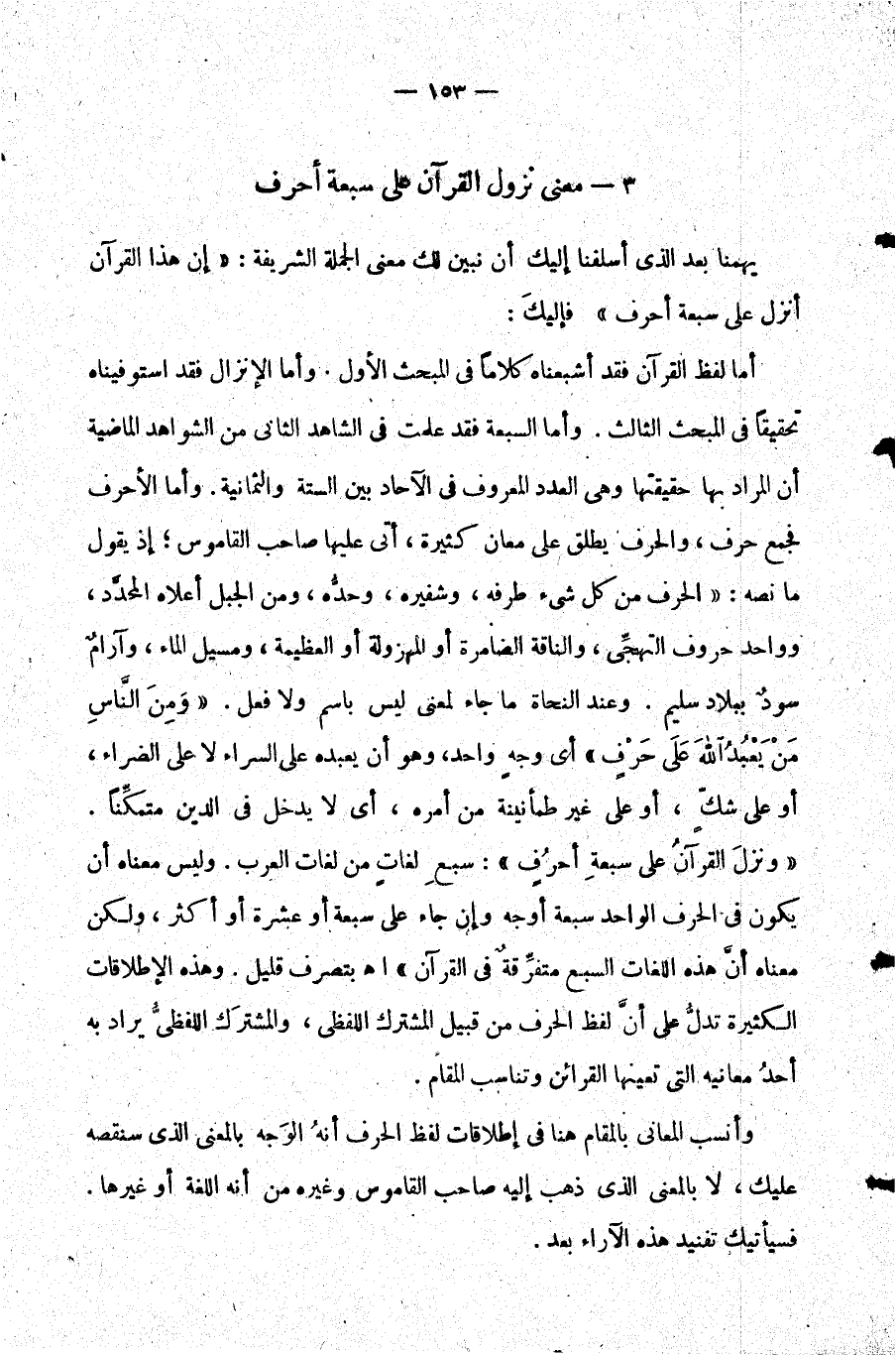 وأنسب المعاني بالمقام هنا في إطلاقات لفظ الحرف أنه الوجه بالمعنى الذي سنقصه عليك لا بالمعنى الذي ذهب إليه صاحب القاموس وغيره من أنه اللغة أو غيرها. فسيأتيك تفنيد هذه الآراء بعد.