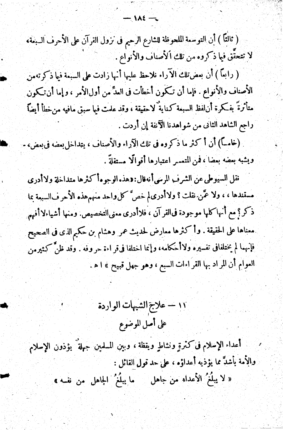 رابعا: أن بعض تلك الآراء نلاحظ عليها أنها زادت على السبعة فيما ذكرته من الأصناف والأنواع. فإما أن تكون أخطأت في العد من أول الأمر وإما أن تكون متأثرة بفكرة أن لفظ السبعة كناية لا حقيقة وقد علمت فيما سبق ما فيه من خطأ أيضا راجع الشاهد الثاني من شواهدنا الآنفة إن أردت.
