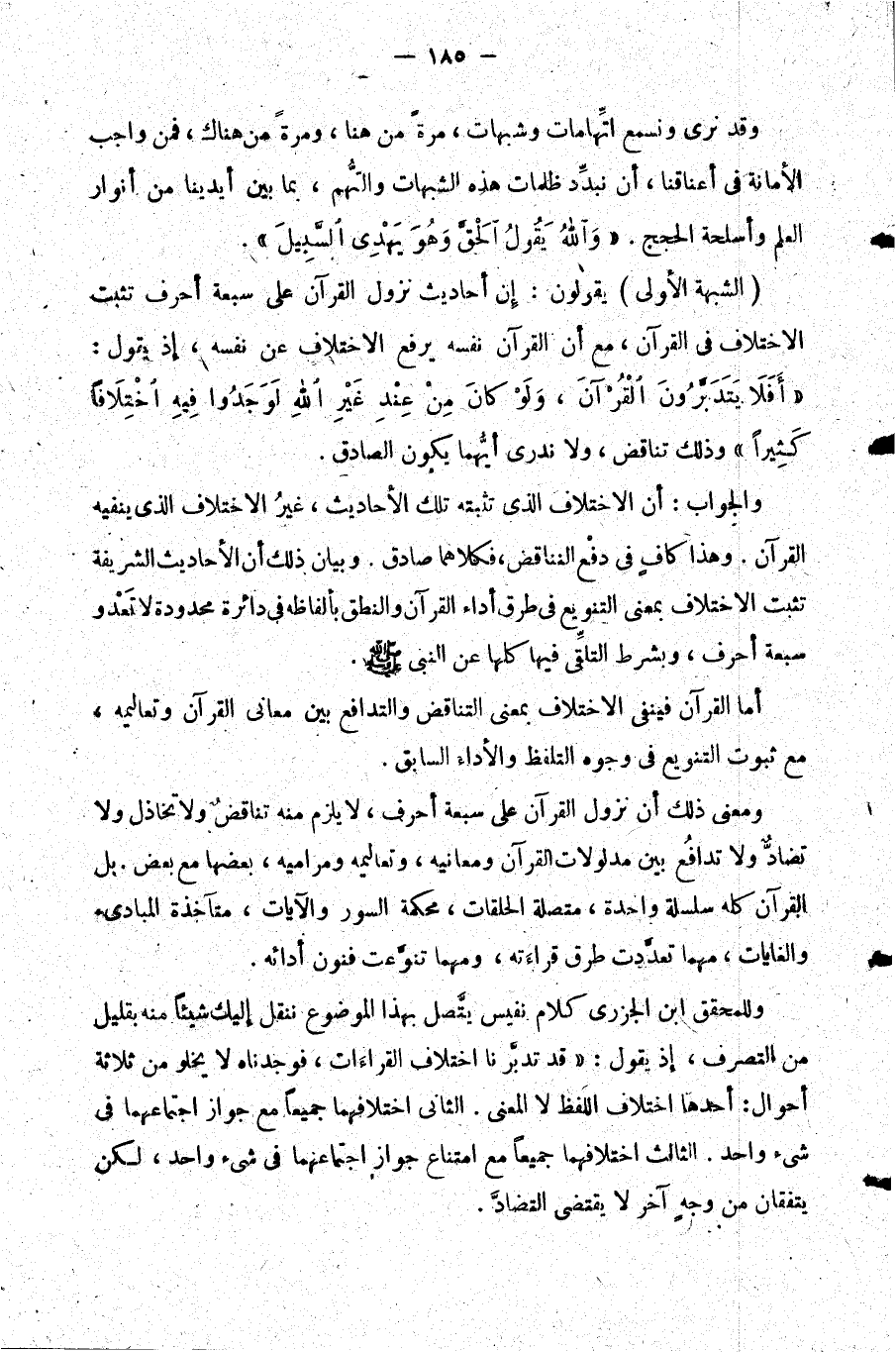 الشبهة الأولى يقولون: إن أحاديث نزول القرآن على سبعة أحرف تثبت الاختلاف في القرآن مع أن القرآن نفسه يرفع الاختلاف عن نفسه إذ يقول: {أَفَلا يَتَدَبَّرُونَ الْقُرْآنَ وَلَوْ كَانَ مِنْ عِنْدِ غَيْرِ اللَّهِ لَوَجَدُوا فِيهِ اخْتِلافاً كَثِيراً} . وذلك تناقض ولا ندري أيهما يكون الصادق.
