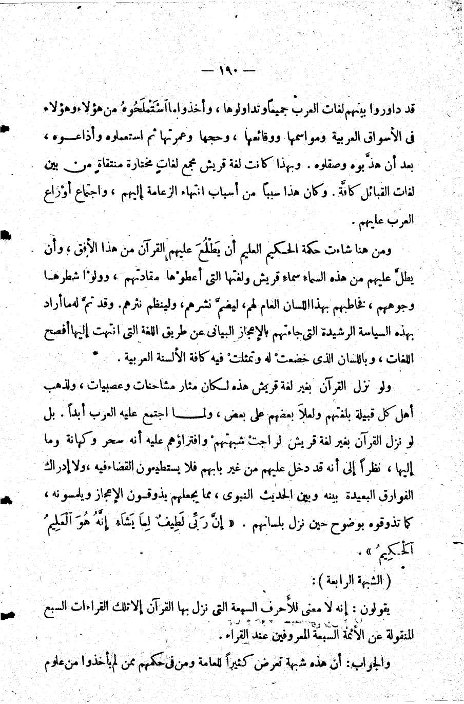 ولو نزل القرآن بغير لغة قريش هذه لكان مثار مشاحنات وعصبيات ولذهب أهل كل قبيلة بلغتهم ولعلا بعضهم على بعض ولما اجتمع عليه العرب أبدا. بل لو نزل القرآن بغير لغة قريش لراجت شبهتهم وافتراؤهم عليه أنه سحر وكهانة وما إليها نظرا إلى أنه قد دخل عليهم من غير بابهم فلا يستطيعون القضاء فيه ولا إدراك الفوارق البعيدة بينه وبين الحديث النبوي مما يجعلهم يذوقون الإعجاز ويلمسونه كما تذوقوه بوضوح حين نزل بلسانهم. {إِنَّ رَبِّي لَطِيفٌ لِمَا يَشَاءُ إِنَّهُ هُوَ الْعَلِيمُ الْحَكِيمُ} .