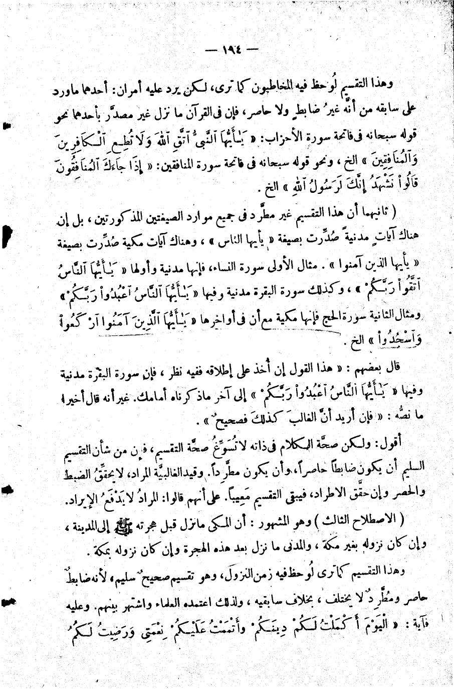 ثانيهما: أن هذا التقسيم غير مطرد في جميع موارد الصيغتين المذكورتين بل إن هناك آيات مدنية صدرت بصيغة {يَا أَيُّهَا النَّاسُ} وهناك آيات مكية صدرت بصيغة {يَا أَيُّهَا الَّذِينَ آمَنُوا} . مثال الأولى سورة النساء فإنها مدنية وأولها {يَا أَيُّهَا النَّاسُ اتَّقُوا رَبَّكُمُ} وكذلك سورة البقرة مدنية وفيها {يَا أَيُّهَا النَّاسُ اعْبُدُوا رَبَّكُمُ} ومثال الثانية سورة الحج فإنها مكية مع أن في أواخرها {يَا أَيُّهَا الَّذِينَ آمَنُوا ارْكَعُوا وَاسْجُدُوا} الخ.