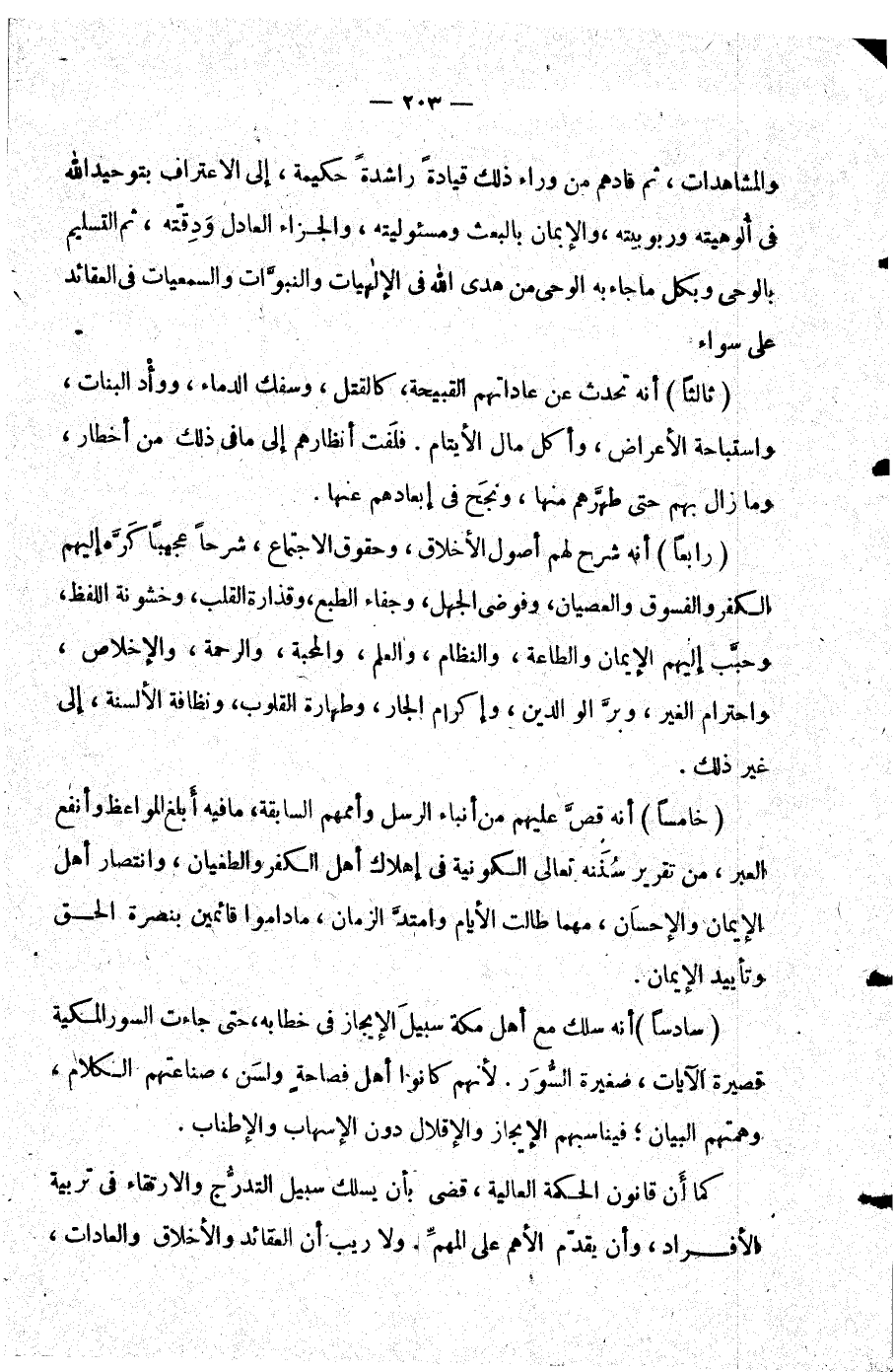 رابعا أنه شرح لهم أصول الأخلاق وحقوق الاجتماع شرحا عجيبا كره إليهم الكفر والفسوق والعصيان وفوضى الجهل وجفاء الطبع وقذارة القلب وخشونة اللفظ وحبب إليهم الإيمان والطاعة والنظام والعلم والمحبة والرحمة والإخلاص واحترام الغير وبر الوالدين وإكرام الجار وطهارة القلوب ونظافة الألسنة إلى غير ذلك.
