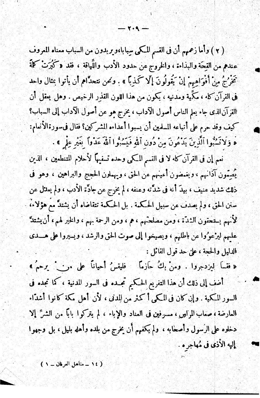 2- وأما زعمهم أن في القسم المكي سبابا ويريدون من السباب معناه المعروف عندهم من القحة والبذاءة والخروج عن حدود الأدب واللياقة فقد {كَبُرَتْ كَلِمَةً تَخْرُجُ مِنْ أَفْوَاهِهِمْ إِنْ يَقُولُونَ إِلَّا كَذِباً} . ونحن نتحداهم أن يأتوا بمثال واحد في القرآن كله مكيه ومدنيه يكون من هذا اللون القذر الرخيص. وهل يعقل أن القرآن الذي جاء يعلم الناس أصول الآداب يخرج هو عن أصول الآداب إلى السباب؟ كيف وقد حرم على أتباعه المسلمين أن يسبوا أعداءه المشركين؟ فقال في سورة الأنعام: {وَلا تَسُبُّوا الَّذِينَ يَدْعُونَ مِنْ دُونِ اللَّهِ فَيَسُبُّوا اللَّهَ عَدْواً بِغَيْرِ عِلْمٍ} .