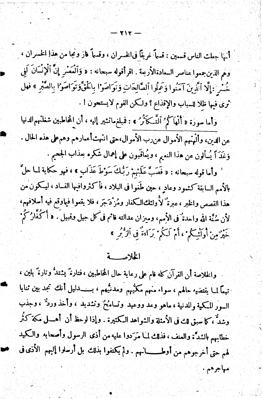 أنها جعلت الناس قسمين: قسما غريقا في الخسران وقسما فاز ونجا من هذا الخسران وهم الذين جمعوا عناصر السعادة الأربعة. اقرأ قوله سبحانه: {وَالْعَصْرِ إِنَّ الْأِنْسَانَ لَفِي خُسْرٍ: إِلَّا الَّذِينَ آمَنُوا وَعَمِلُوا الصَّالِحَاتِ وَتَوَاصَوْا بِالْحَقِّ وَتَوَاصَوْا بِالصَّبْرِ} فهل ترى فيها ظلا للسباب والإقذاع؟ ولكن القوم لا يستحون.
