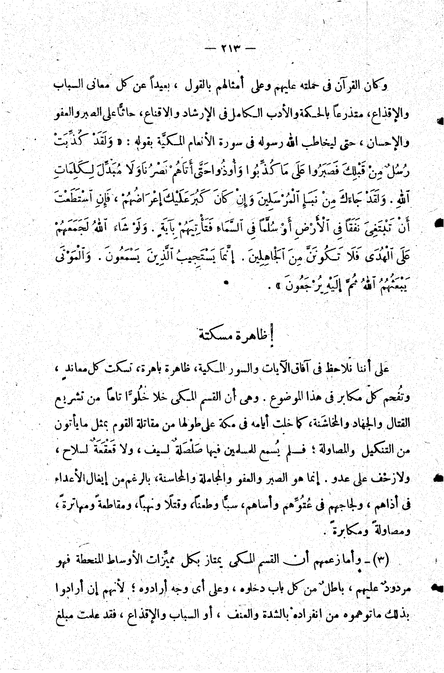 3- وأما زعمهم أن القسم المكي يمتاز بكل مميزات الأوساط المنحطة فهو مردود عليهم باطل من كل باب دخلوه وعلى أي وجه أرادوه لأنهم إن أرادوا بذلك ما توهموه من انفراده بالشدة والعنف أو السباب والإقذاع فقد علمت مبلغ