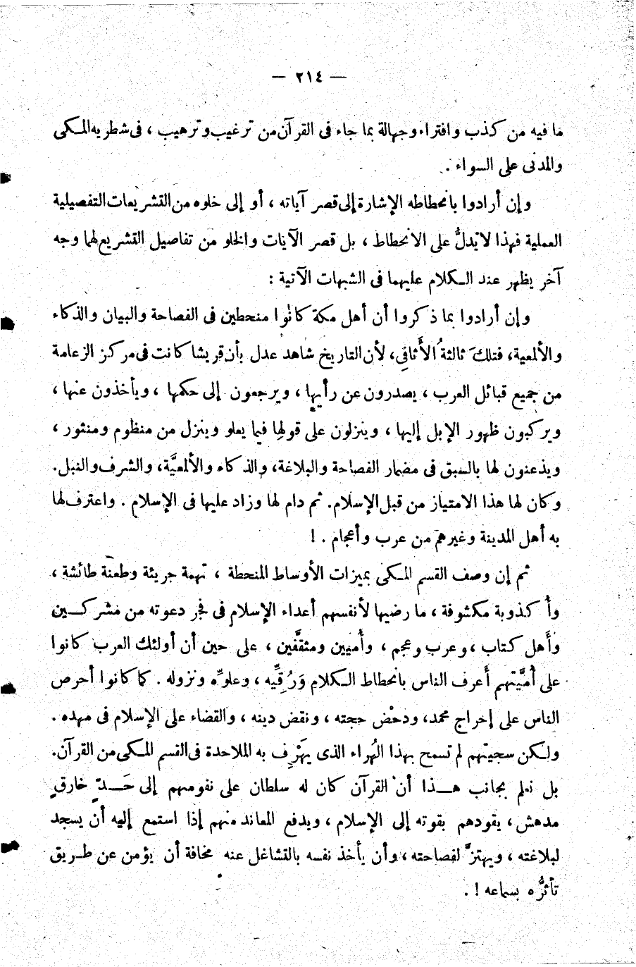 ثم إن وصف القسم المكي بميزات الأوساط المنحطة تهمة جريئة وطعنة طائشة وأكذوبة مكشوفة ما رضيها لأنفسهم أعداء الإسلام في فجر دعوته من مشركين وأهل كتاب وعرب وعجم وأميين ومثقفين على حين أن أولئك العرب كانوا على أميتهم أعرف الناس بانحطاط الكلام ورقيه وعلوه ونزوله. كما كانوا أحرص الناس على إحراج محمد ودحض حجته ونقض دينه والقضاء على الإسلام في مهده. ولكن سجيتهم لم تسمح بهذا الهراء الذي يهرف به الملاحدة في القسم المكي من القرآن. بل نعلم بجانب هذا أن القرآن كان له سلطان على نفوسهم إلى حد خارق مدهش يقودهم بقوته إلى الإسلام ويدفع المعاند منهم إذا استمع إليه أن يسجد لبلاغته ويهتز لفصاحته وأن يأخذ نفسه بالتشاغل عنه مخافة أن يؤمن عن طريق تأثره بسماعه.