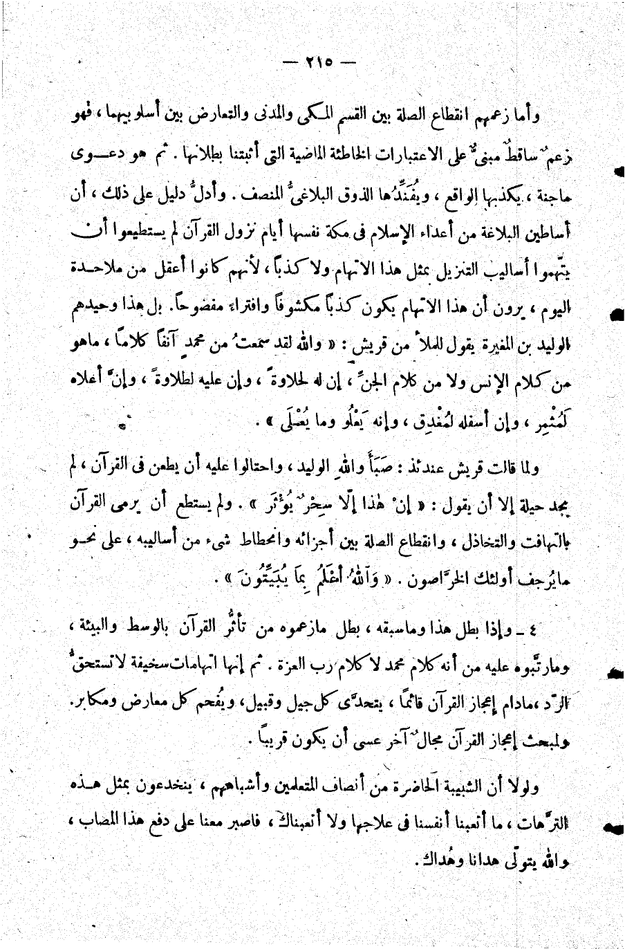 وأما زعمهم انقطاع الصلة بين القسم المكي والمدني والتعارض بين أسلوبيهما فهو زعم ساقط مبني على الاعتبارات الخاطئة الماضية التي أثبتنا بطلانها. ثم هو دعوى ماجنة يكذبها الواقع ويفندها الذوق البلاغي المنصف. وأدل دليل على ذلك أن أساطين البلاغة من أعداء الإسلام في مكة نفسها أيام نزول القرآن لم يستطيعوا أن يتهموا أساليب التنزيل بمثل هذا الاتهام ولا كذبا لأنهم كانوا أعقل من ملاحدة اليوم يرون أن هذا الاتهام يكون كذبا مكشوفا وافتراء مفضوحا. بل هذا وحيدهم الوليد بن المغيرة يقول للملأ من قريش: والله لقد سمعت من محمد آنفا كلاما ما هو من كلام الإنس ولا من كلام الجن إن له لحلاوة وإن عليه لطلاوة وإن أعلاه لمثمر وإن أسفله لمغدق وإنه يعلو وما يعلى.