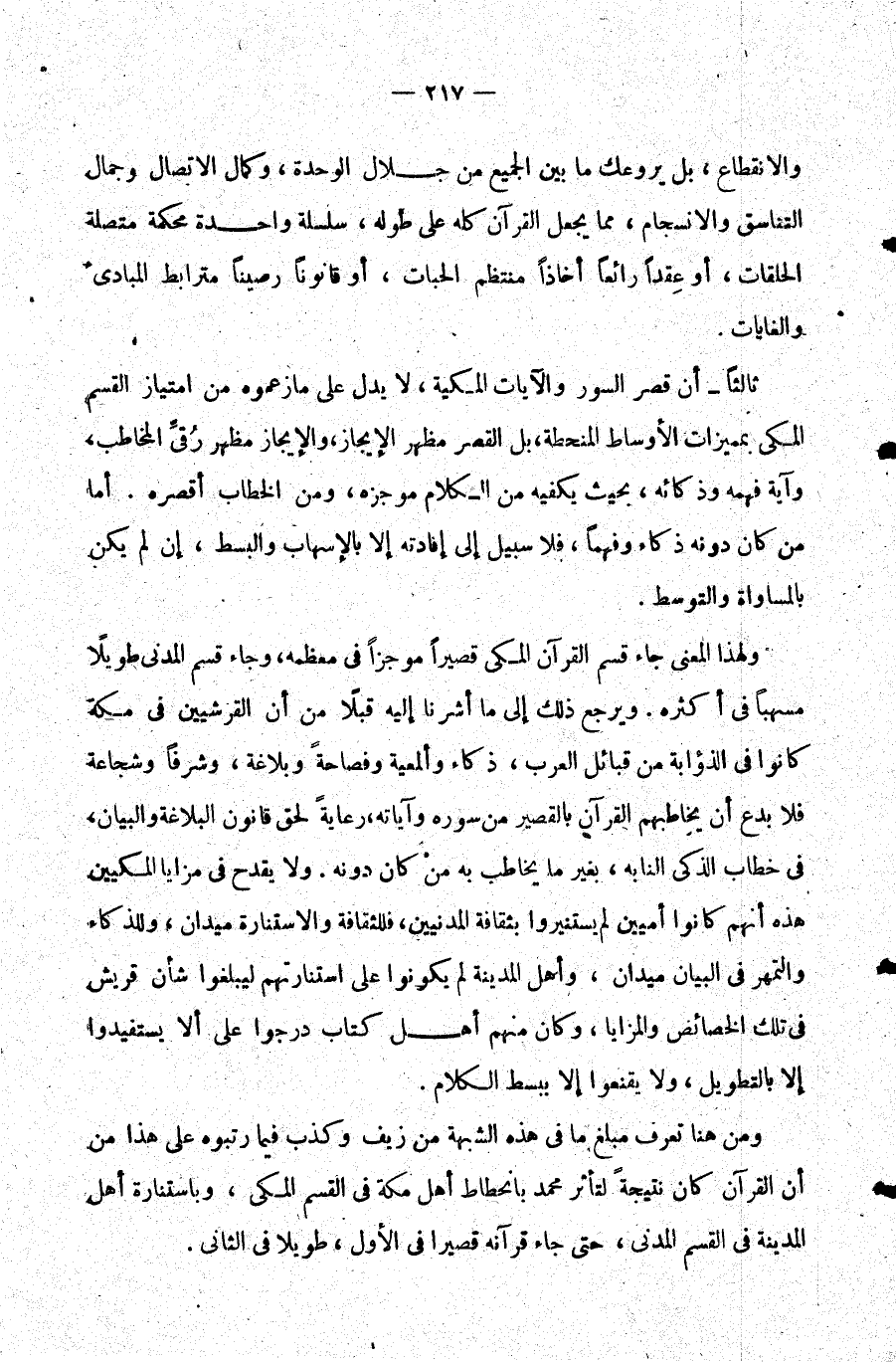 ثالثا - أن قصر السور والآيات المكية لا يدل على ما زعموه من امتياز القسم المكي بمميزات الأوساط المنحطة بل القصر مظهر الإيجاز والإيجاز مظهر رقي المخاطب وآية فهمه وذكائه بحيث يكفيه من الكلام موجزه ومن الخطاب أقصره. أما من كان دونه ذكاء وفهما فلا سبيل إلى إفادته إلا بالإسهاب والبسط إن لم يكن بالمساواة والتوسط.