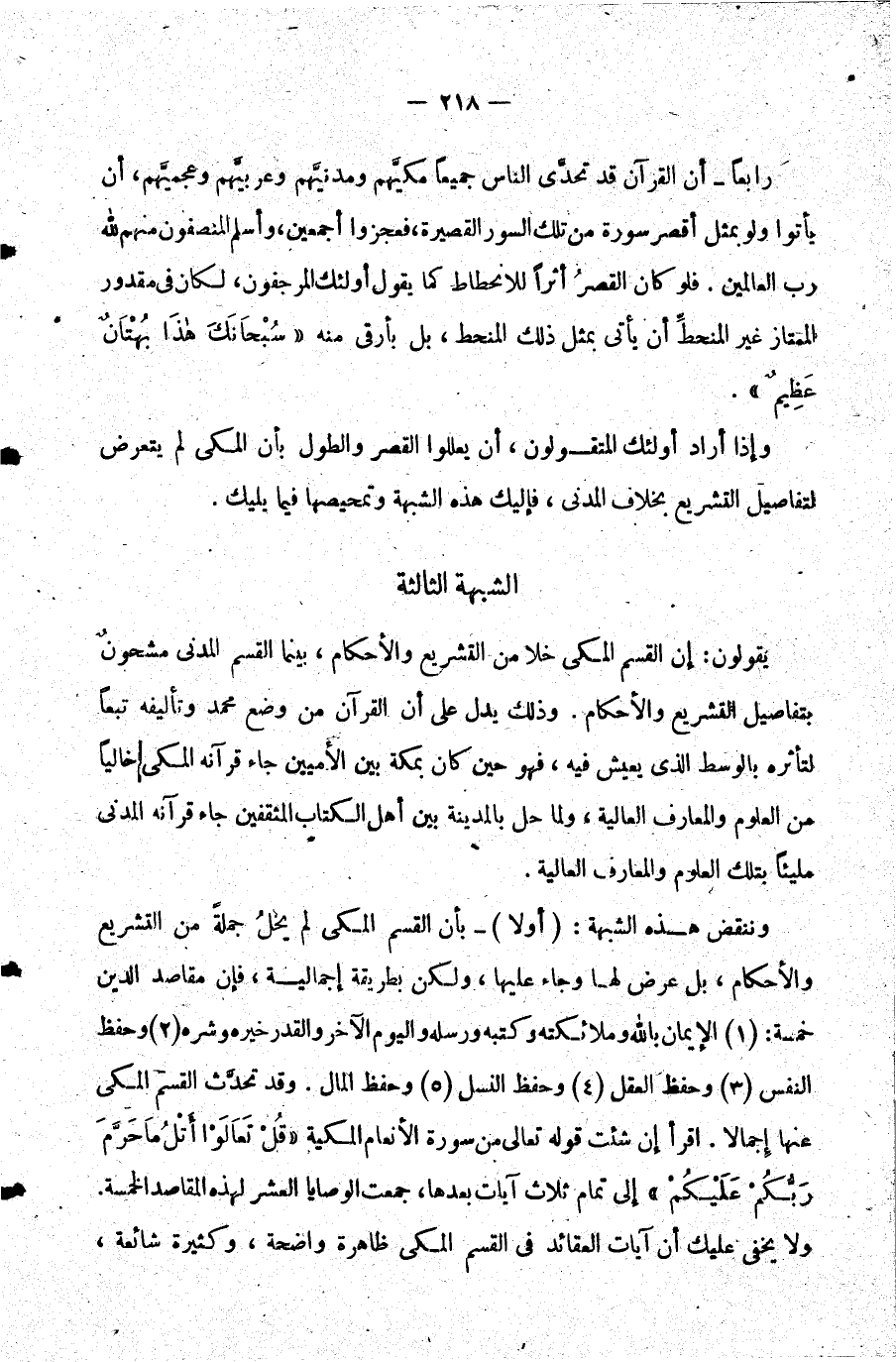 وننقض هذه الشبهة: أولا - بأن القسم المكي لم يخل جملة من التشريع والأحكام بل عرض لها وجاء عليها ولكن بطريقة إجمالية فإن مقاصد الدين خمسة: 1- الإيمان بالله وملائكته وكتبه ورسله واليوم الآخر والقدر خيره وشره. 2 - وحفظ النفس. 3 - وحفظ العقل. 4 - وحفظ النسل. 5 - وحفظ المال. وقد تحدث القسم المكي عنها إجمالا. اقرأ إن شئت قوله تعالى من سورة الأنعام المكية: {قُلْ تَعَالَوْا أَتْلُ مَا حَرَّمَ رَبُّكُمْ عَلَيْكُمْ} إلى تمام ثلاث آيات بعدها جمعت الوصايا العشر لهذه المقاصد الخمسة. ولا يخفى عليك أن آيات العقائد في القسم المكي ظاهرة واضحة وكثيرة شائعة،