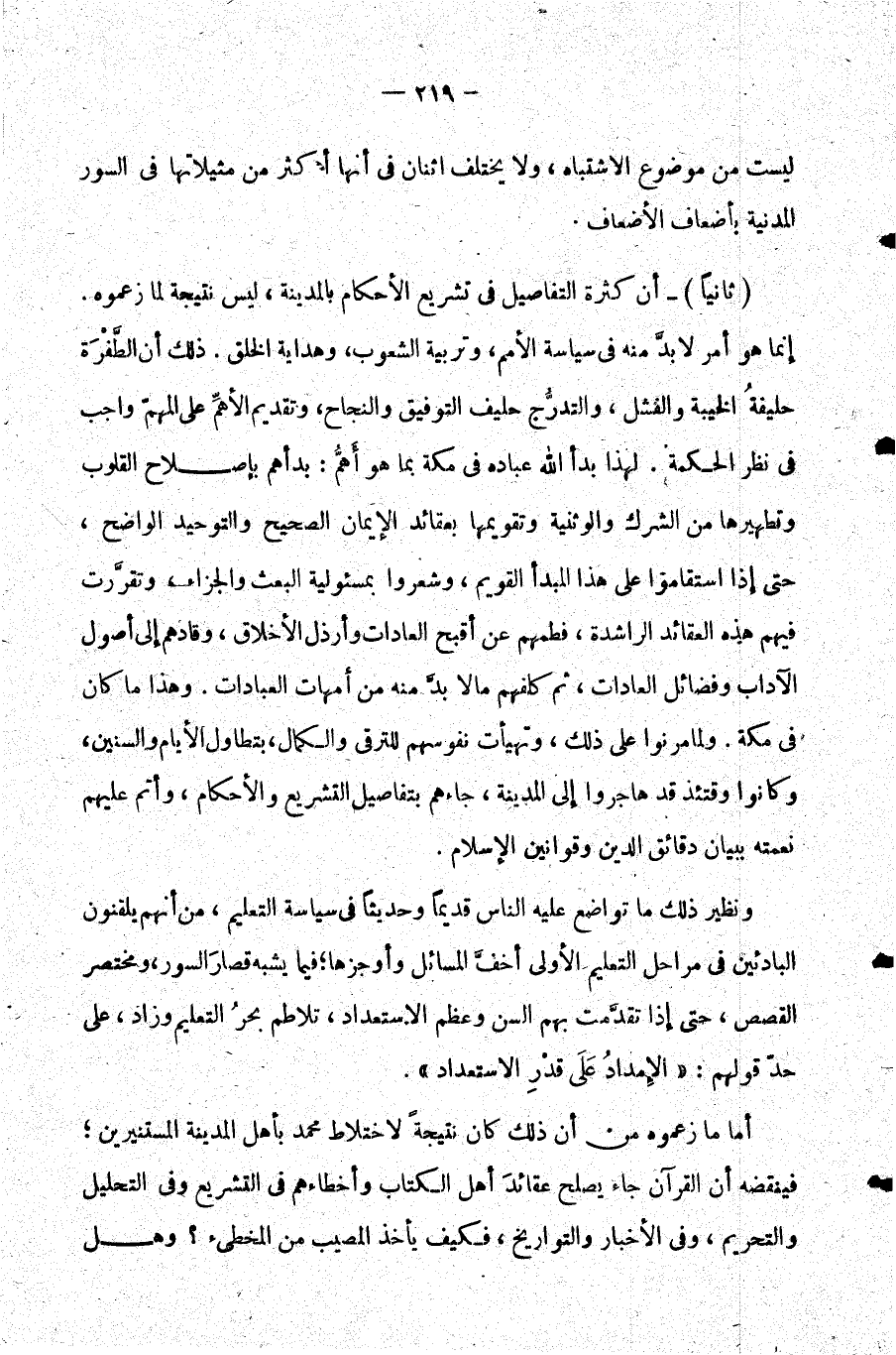 ثانيا - أن كثرة التفاصيل في تشريع الأحكام بالمدينة ليس نتيجة لما زعموه. إنما هو أمر لا بد منه في سياسة الأمم وتربية الشعوب وهداية الخلق. ذلك أن الطفرة حليفة الخيبة والفشل والتدرج حليف التوفيق والنجاح وتقديم الأهم على المهم واجب في نظر الحكمة. لهذا بدأ الله عباده في مكة بما هو أهم: بدأهم بإصلاح القلوب وتطهيرها من الشرك والوثنية وتقويمها بعقائد الإيمان الصحيح والتوحيد الواضح حتى إذا استقاموا على هذا المبدأ القويم وشعروا بمسؤولية البعث والجزاء وتقررت فيهم هذه العقائد الراشدة فطمهم عن أقبح العادات وأرذل الأخلاق وقادهم إلى أصول الآداب وفضائل العادات ثم كلفهم ما لا بد منه من أمهات العبادات. وهذا ما كان في مكة. ولما مرنوا على ذلك وتهيأت نفوسهم للترقي والكمال بتطاول الأيام والسنين وكانوا وقتئذ قد هاجروا إلى المدينة جاءهم بتفاصيل التشريع والأحكام وأتم عليهم نعمته ببيان دقائق الدين وقوانين الإسلام.