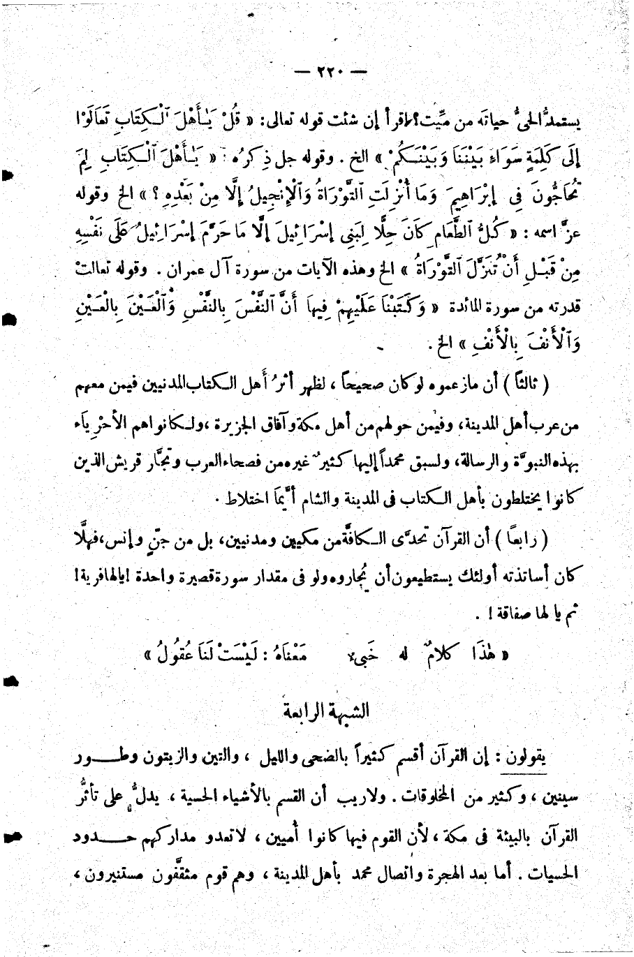 يستمد الحي حياته من ميت اقرأ إن شئت قوله تعالى: {قُلْ يَا أَهْلَ الْكِتَابِ تَعَالَوْا إِلَى كَلِمَةٍ سَوَاءٍ بَيْنَنَا وَبَيْنَكُمْ} الخ. وقوله جل ذكره: {يَا أَهْلَ الْكِتَابِ لِمَ تُحَاجُّونَ فِي إِبْرَاهِيمَ وَمَا أُنْزِلَتِ التَّوْرَاةُ وَالْأِنْجِيلُ إِلَّا مِنْ بَعْدِهِ} ؟ الخ وقوله عز اسمه: {كُلُّ الطَّعَامِ كَانَ حِلاًّ لِبَنِي إِسْرائيلَ إِلَّا مَا حَرَّمَ إِسْرائيلُ عَلَى نَفْسِهِ مِنْ قَبْلِ أَنْ تُنَزَّلَ التَّوْرَاةُ} الخ وهذه الآيات من سورة آل عمران. وقوله تعالت قدرته من سورة المائدة {وَكَتَبْنَا عَلَيْهِمْ فِيهَا أَنَّ النَّفْسَ بِالنَّفْسِ وَالْعَيْنَ بِالْعَيْنِ وَالْأَنْفَ بِالْأَنْفِ} الخ.