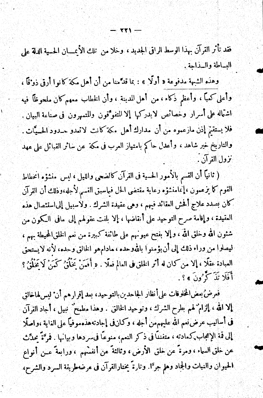 وهذه الشبهة مدفوعة أولا: بما قدمنا من أن أهل مكة كانوا أرقى ذوقا وأعلى كعبا وأعظم ذكاء من أهل المدينة وأن الخطاب معهم كان ملحوظا فيه اشتماله على أسرار وخصائص لا يدركها إلا المتفوقون والمتمهرون في صناعة البيان. فلا يستقيم إذن ما زعموه من أن مدارك أهل مكة كانت لا تعدو حدود الحسيات. والتاريخ خير شاهد وأعدل حاكم بامتياز العرب في مكة عن سائر القبائل على عهد نزول القرآن.