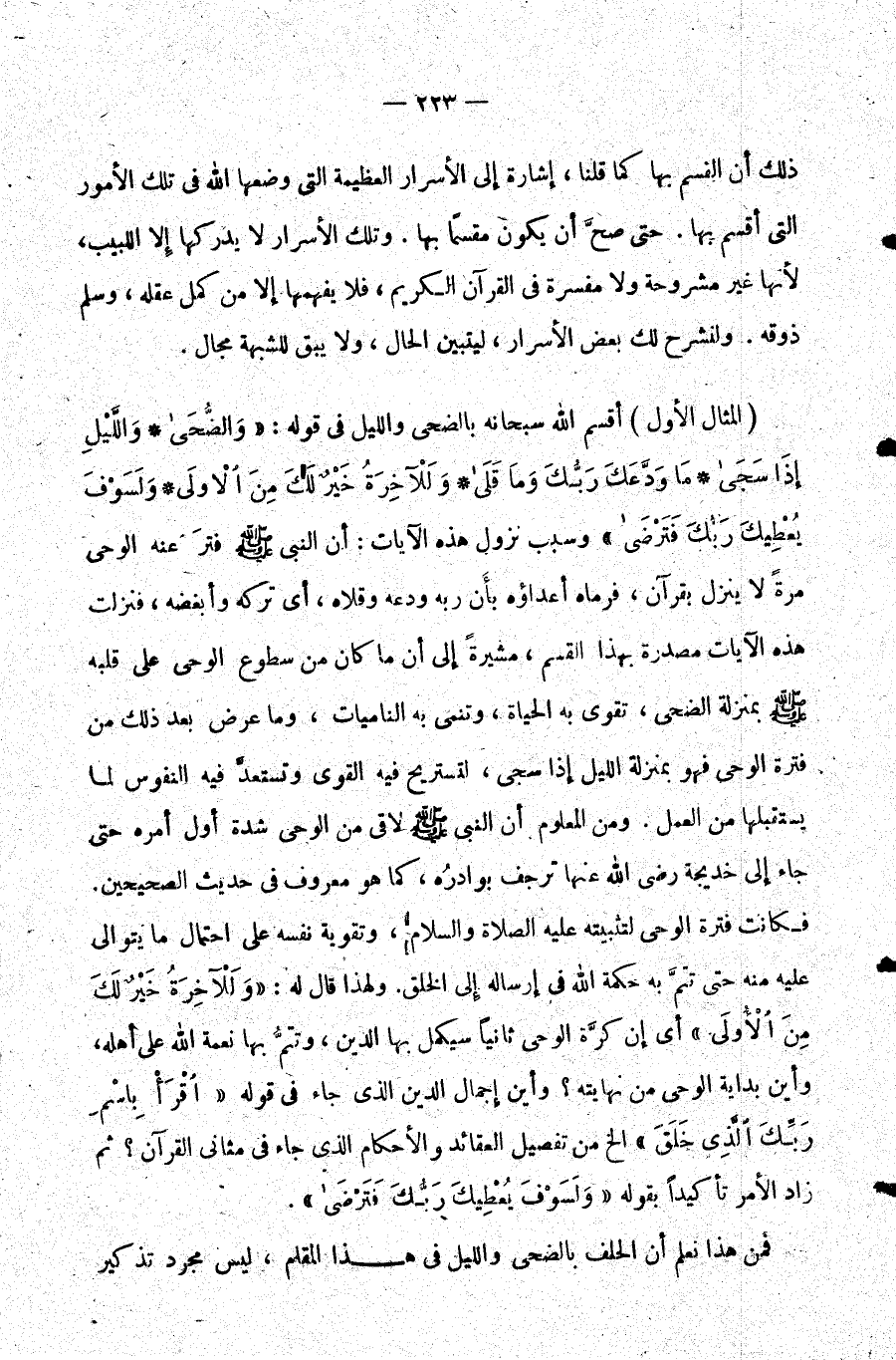 المثال الأول: أقسم الله سبحانه بالضحى والليل في قوله: {وَالضُّحَى وَاللَّيْلِ إِذَا سَجَى مَا وَدَّعَكَ رَبُّكَ وَمَا قَلَى وَلَلآخِرَةُ خَيْرٌ لَكَ مِنَ الْأُولَى وَلَسَوْفَ يُعْطِيكَ رَبُّكَ فَتَرْضَى} وسبب نزول هذه الآيات: أن النبي صلى الله عليه وسلم فتر عنه الوحي مرة لا ينزل بقرآن فرماه أعداؤه بأن ربه ودعه وقلاه أي تركه وأبغضه فنزلت هذه الآيات مصدرة بهذا القسم مشيرة إلى أن ما كان من سطوع الوحي على قلبه صلى الله عليه وسلم بمنزلة الضحى تقوى به الحياة وتنمى به الناميات وما عرض بعد ذلك من فترة الوحي فهو بمنزلة الليل إذا سجى لتستريح فيه القوى وتستعد فيه النفوس لما يستقبلها من العمل. ومن المعلوم أن النبي صلى الله عليه وسلم لاقى من الوحي شدة أول أمره حتى جاء إلى خديجة رضي الله عنها ترجف بوادره كما هو معروف في حديث الصحيحين. فكانت فترة الوحي لتثبيته عليه الصلاة والسلام وتقوية نفسه على احتمال ما يتوالى عليه منه حتى تتم به حكمة الله في إرساله إلى الخلق. ولهذا قال له: {وَلَلآخِرَةُ خَيْرٌ لَكَ مِنَ الْأُولَى} أي إن كرة الوحي ثانيا سيكمل بها الدين وتتم بها نعمة الله على أهله وأين بداية الوحي من نهايته؟ وأين إجمال الدين الذي جاء في قوله {اقْرَأْ بِاسْمِ رَبِّكَ الَّذِي خَلَقَ} الخ من تفصيل العقائد والأحكام الذي جاء في مثاني القرآن ثم زاد الأمر تأكيدا بقوله {وَلَسَوْفَ يُعْطِيكَ رَبُّكَ فَتَرْضَى} .