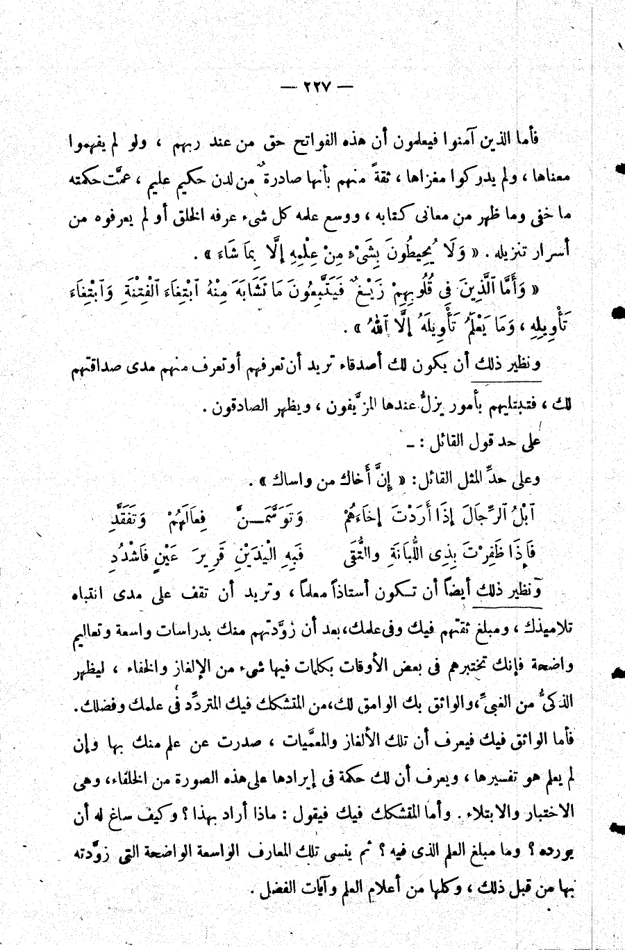 ونظير ذلك أيضا أن تكون أستاذا معلما وتريد أن تقف على مدى انتباه تلاميذك ومبلغ ثقتهم فيك وفي علمك بعد أن زودتهم منك بدراسات واسعة وتعاليم واضحة فإنك تختبرهم في بعض الأوقات بكلمات فيها شيء من الإلغاز والخفاء ليظهر الذكي من الغبي والواثق بك الوامق لك من المتشكك فيك المتردد في علمك وفضلك. فأما الواثق فيك فيعرف أن تلك الألغاز والمعميات صدرت عن علم منك بها وإن لم يعلم هو تفسيرها ويعرف أن لك حكمة في إيرادها على هذه الصورة من الخلفاء وهي الاختبار والابتلاء. وأما المتشكك فيك فيقول: ماذا أراد بهذا؟ وكيف ساغ له أن يورده؟ وما مبلغ العلم الذي فيه؟ ثم ينسى تلك المعارف الواسعة الواضحة التي زودته بها من قبل ذلك وكلها من أعلام العلم وآيات الفضل.