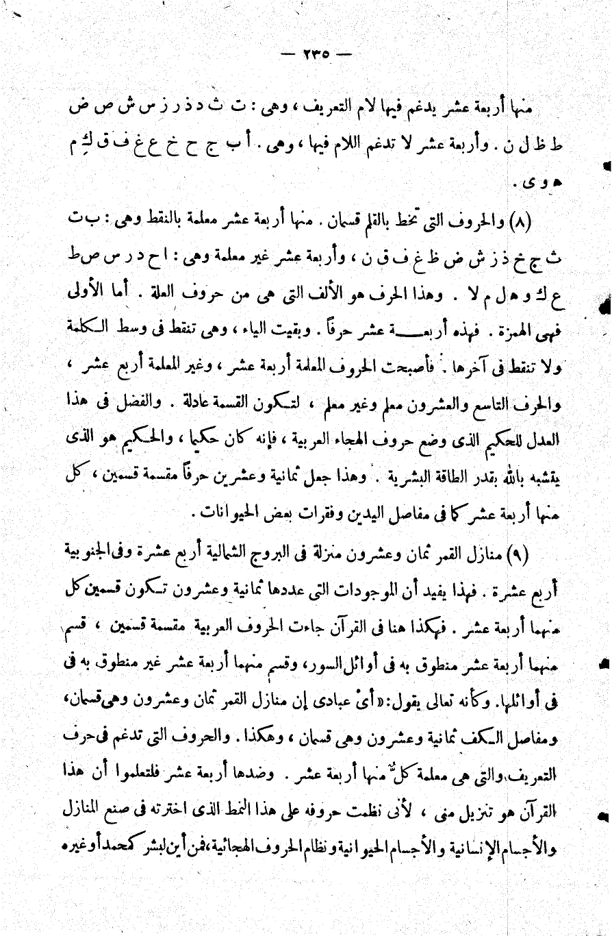 9- منازل القمر ثمان وعشرون منزلة في البروج الشمالية أربع عشرة وفي الجنوبية أربع عشرة. فهذا يفيد أن الموجودات التي عددها ثمانية وعشرون تكون قسمين كل منهما أربعة عشر. فهكذا هنا في القرآن جاءت الحروف العربية مقسمة قسمين قسم منهما أربعة عشر منطوق به في أوائل السور وقسم منهما أربعة عشر غير منطوق به في أوائلها. وكأنه تعالى يقول أي عبادي إن منازل القمر ثمان وعشرون وهي قسمان ومفاصل الكف ثمانية وعشرون وهي قسمان وهكذا. والحروف التي تدغم في حرف التعريف والتي هي معلمة كل منها أربعة عشر. وضدها أربعة عشر فلتعلموا أن هذا القرآن هو تنزيل مني لأني نظمت حروفه على هذا النمط الذي أخترته في صنع المنازل والأجسام الإنسانية والأجسام الحيوانية ونظام الحروف الهجائية فمن أين لبشر كمحمد أو غيره