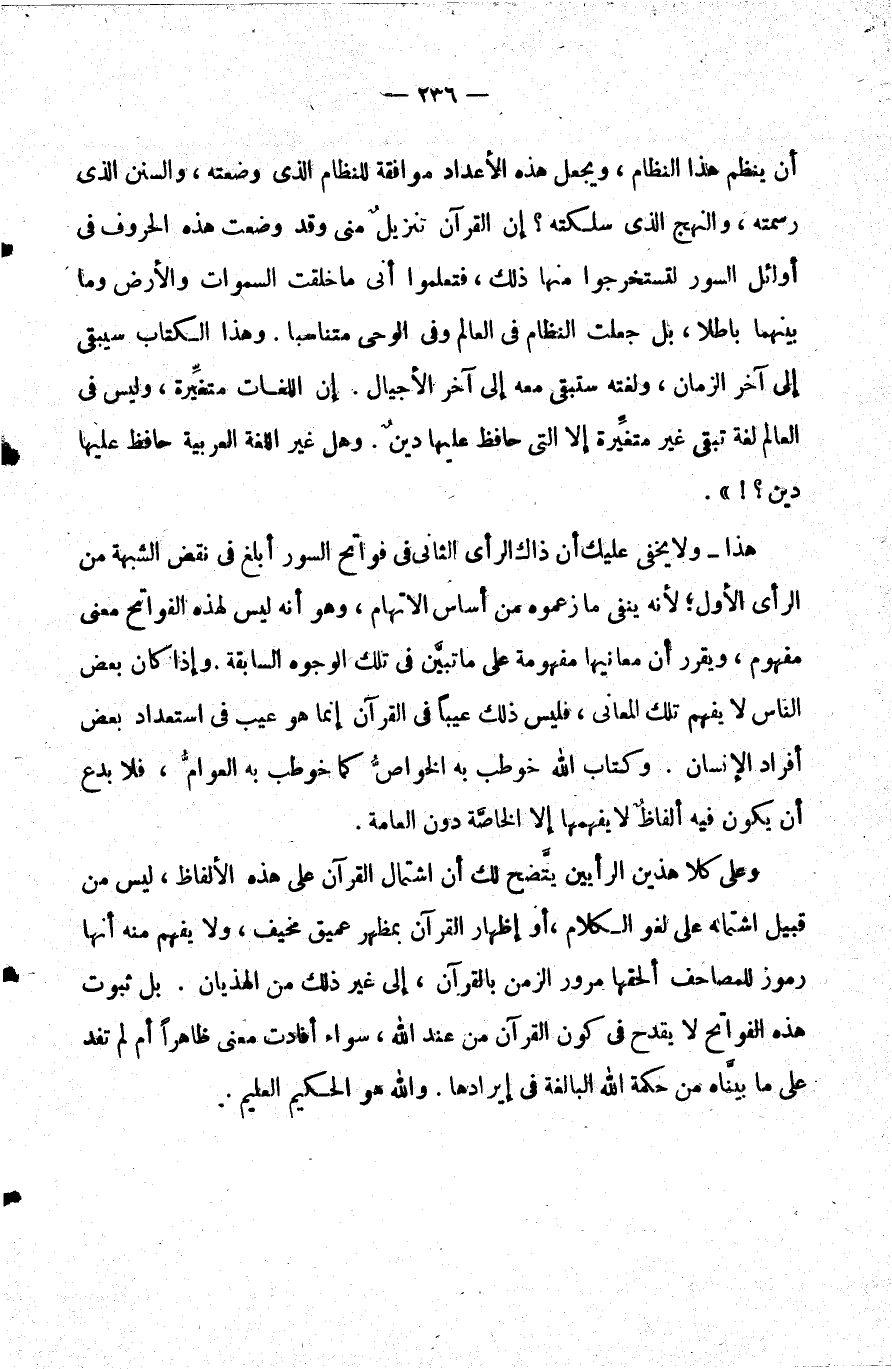 أن ينظم هذا النظام ويجعل هذه الأعداد موافقة للنظام الذي وضعته والسنن الذي رسمته والنهج الذي سلكته؟ إن القرآن تنزيل مني وقد وضعت هذه الحروف في أوائل السور لتستخرجوا منها ذلك فتعلموا أني ما خلقت السموات والأرض وما بينهما باطلا بل جعلت النظام في العالم وفي الوحي متناسبا. وهذا الكتاب سيبقى إلى آخر الزمان ولغته ستبقى معه إلى آخر الأجيال. إن اللغات متغيرة وليس في العالم لغة تبقى غير متغيرة إلا التي حافظ عليها دين. وهل غير اللغة العربية حافظ عليها دين؟.
