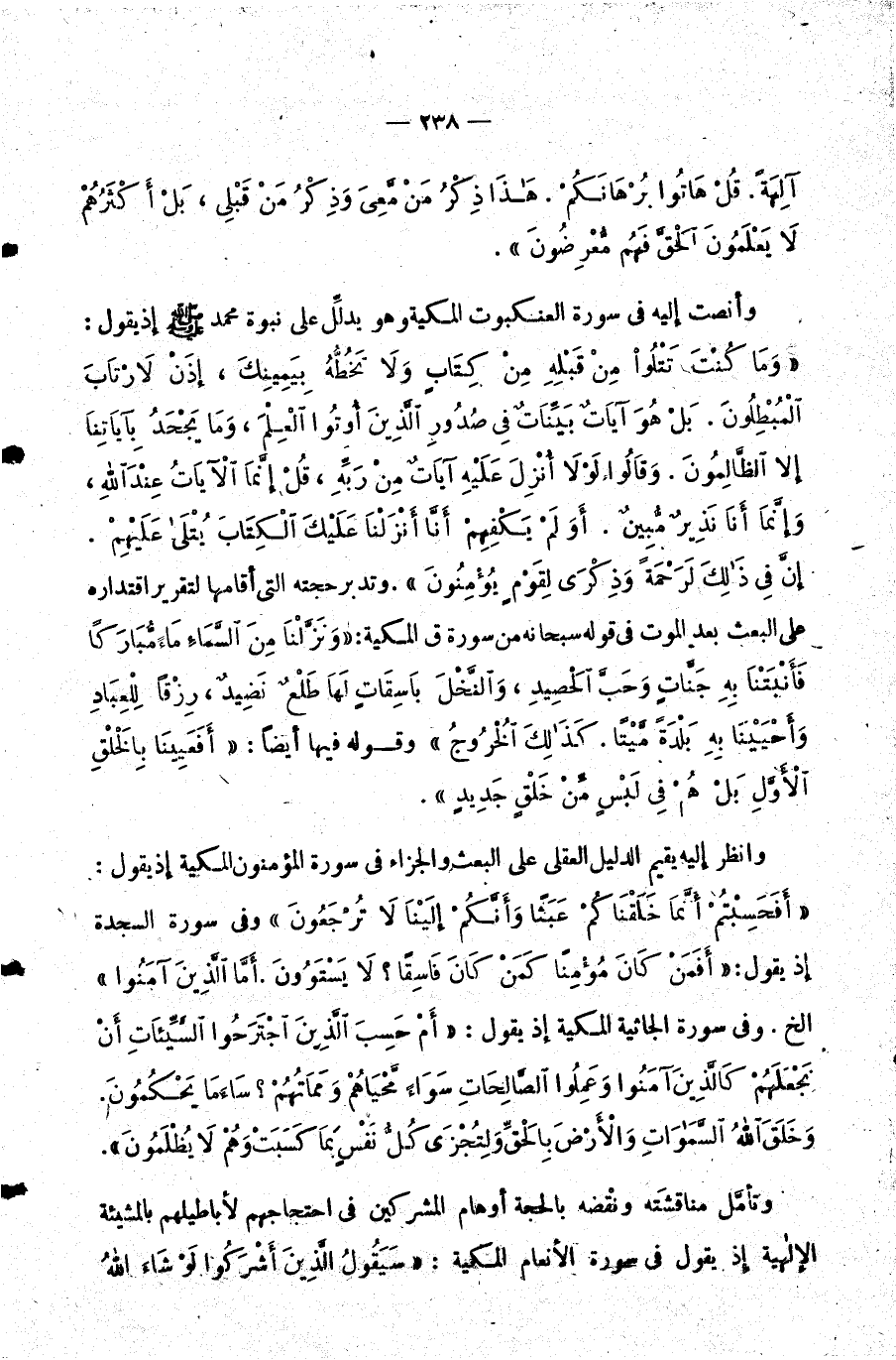 وانظر إليه يقيم الدليل العقلي على البعث والجزاء في سورة المؤمنون المكية إذ يقول: {أَفَحَسِبْتُمْ أَنَّمَا خَلَقْنَاكُمْ عَبَثاً وَأَنَّكُمْ إِلَيْنَا لا تُرْجَعُونَ} وفي سورة السجدة إذ يقول: {أَفَمَنْ كَانَ مُؤْمِناً كَمَنْ كَانَ فَاسِقاً لا يَسْتَوُونَ. أَمَّا الَّذِينَ آمَنُوا} الخ. وفي سورة الجاثية المكية إذ يقول: {أَمْ حَسِبَ الَّذِينَ اجْتَرَحُوا السَّيِّئَاتِ أَنْ نَجْعَلَهُمْ كَالَّذِينَ آمَنُوا وَعَمِلُوا الصَّالِحَاتِ سَوَاءً مَحْيَاهُمْ وَمَمَاتُهُمْ سَاءَ مَا يَحْكُمُونَ. وَخَلَقَ اللَّهُ السَّمَاوَاتِ وَالْأَرْضَ بِالْحَقِّ وَلِتُجْزَى كُلُّ نَفْسٍ بِمَا كَسَبَتْ وَهُمْ لا يُظْلَمُونَ} .
