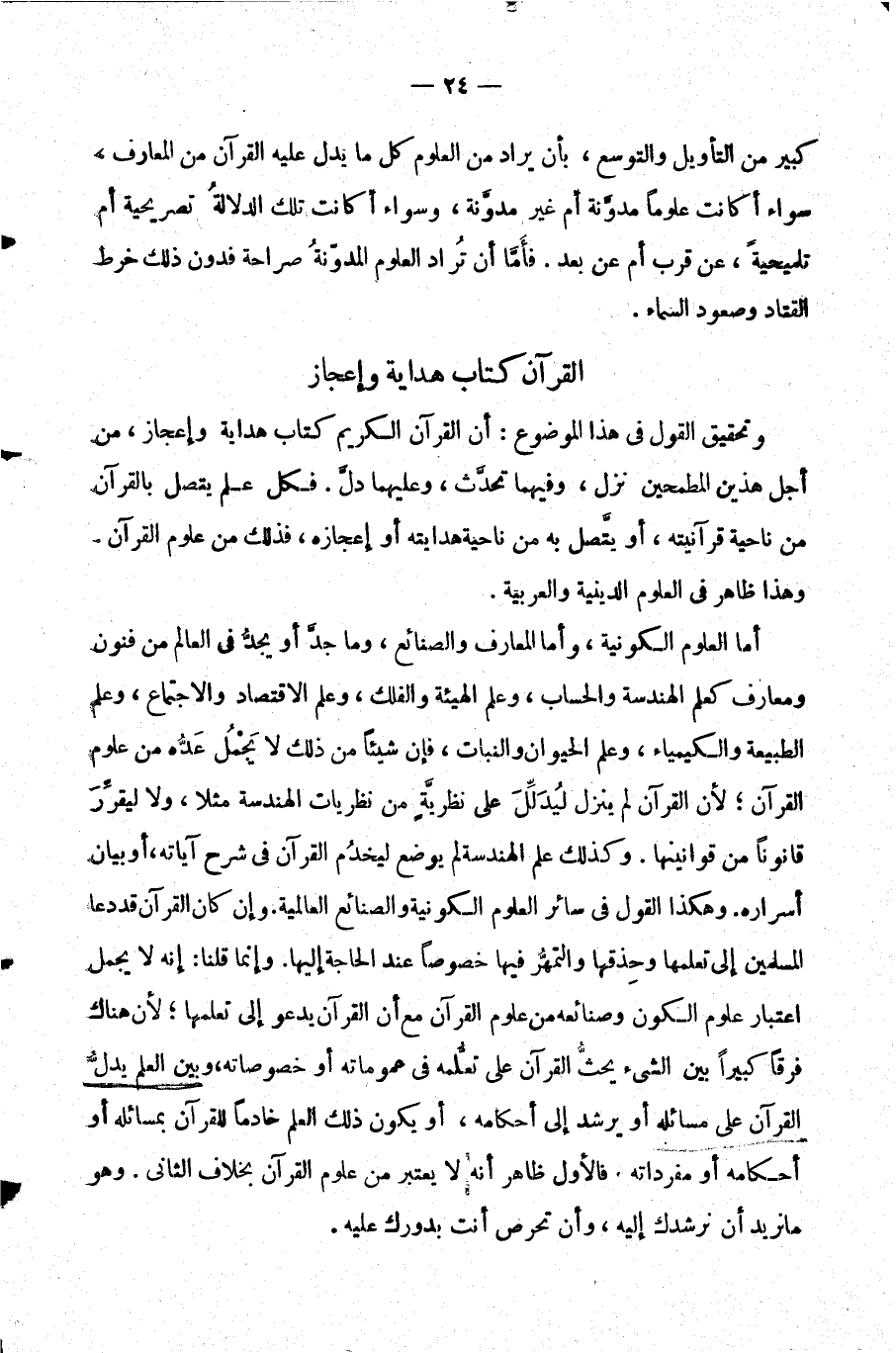 وتحقيق القول في هذا الموضوع: أن القرآن الكريم كتاب هداية وإعجاز من أجل هذين المطمحين نزل وفيهما تحدث وعليهما دل. فكل علم يتصل بالقرآن من ناحية قرأنيته أو يتصل به من ناحية هدايته أو إعجازه فذلك من علوم القرآن. وهذا ظاهر في العلوم الدينية والعربية.