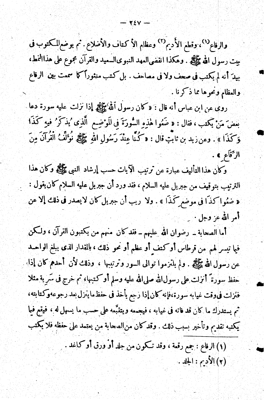 والرقاع1 وقطع الأديم2 وعظام الأكتاف والأضلاع. ثم يوضع المكتوب في بيت رسول الله صلى الله عليه وسلم. وهكذا انقضى العهد النبوي السعيد والقرآن مجموع على هذا النمط بيد أنه لم يكتب في صحف ولا في مصاحف. بل كتب منثورا كما سمعت بين الرقاع والعظام ونحوها مما ذكرنا.
