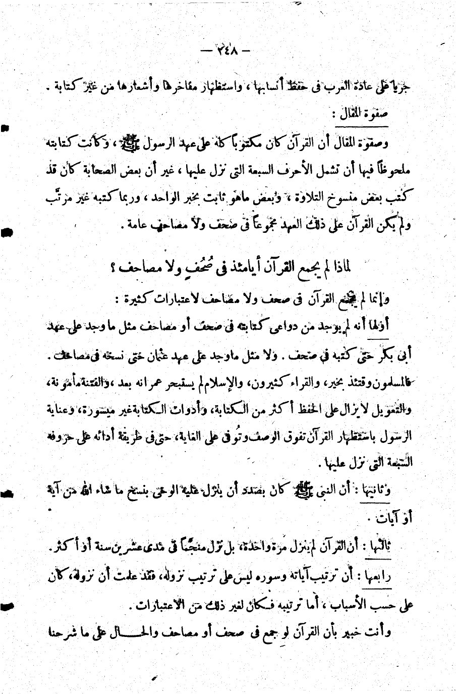 وإنما لم يجمع القرآن في صحف ولا مصاحف لاعتبارات كثيرة: