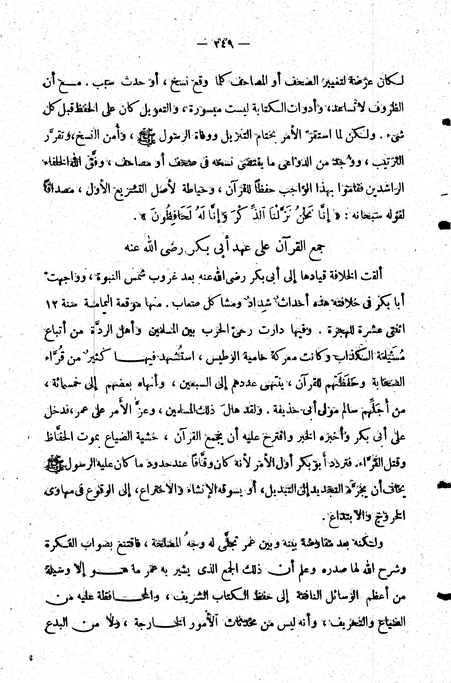 لكان عرضة لتغيير الصحف أو المصاحف كلما وقع نسخ أو حدث سبب. مع أن الظروف لا تساعد وأدوات الكتابة ليست ميسورة والتعويل كان على الحفظ قبل كل شيء. ولكن لما استقر الأمر بختام التنزيل ووفاة الرسول وأمن النسخ وتقرر الترتيب ووجد من الدواعي ما يقتضي نسخه في صحف أو مصاحف وفق الله الخلفاء الراشدين فقاموا بهذا الواجب حفظا للقرآن وحياطة لأصل التشريع الأول مصداقا لقوله سبحانه: {إِنَّا نَحْنُ نَزَّلْنَا الذِّكْرَ وَإِنَّا لَهُ لَحَافِظُونَ} .