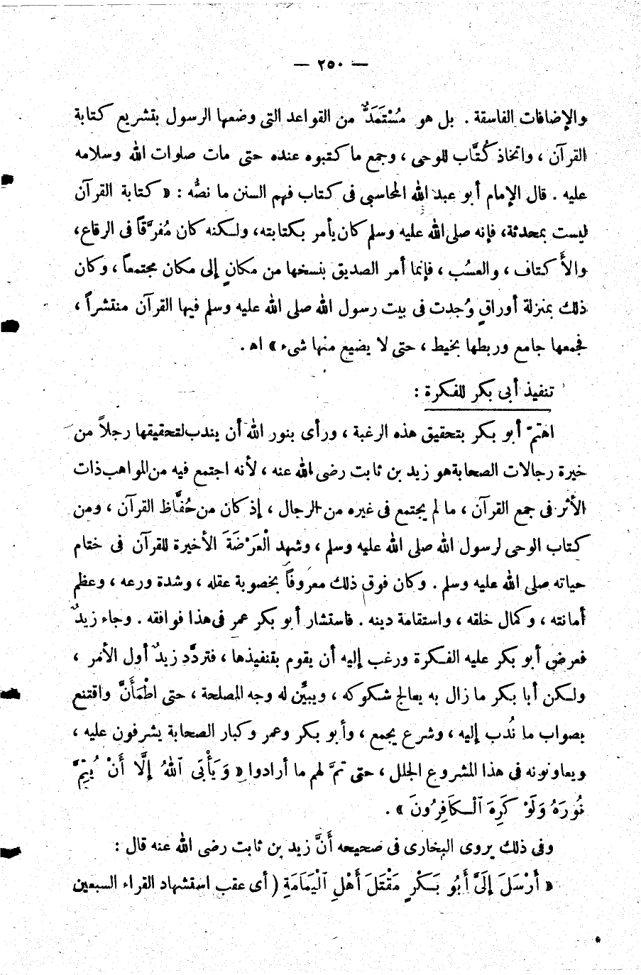 والإضافات الفاسقة. بل هو مستمد من القواعد التي وضعها الرسول بتشريع كتابة القرآن واتخاذ كتاب للوحي وجمع ما كتبوه عنده حتى مات صلوات الله وسلامه عليه. قال الإمام أبو عبد الله المحاسبي في كتاب فهم السنن ما نصه: كتابة القرآن ليست بمحدثة فإنه صلى الله عليه وسلم كان يأمر بكتابته ولكنه كان مفرقا في الرقاع والأكتاف والعسب فإنما أمر الصديق بنسخها من مكان إلى مكان مجتمعا وكان ذلك بمنزلة أوراق وجدت في بيت رسول الله صلى الله عليه وسلم فيها القرآن منتشرا فجمعها جامع وربطها بخيط حتى لا يضيع منها شيء اهـ.