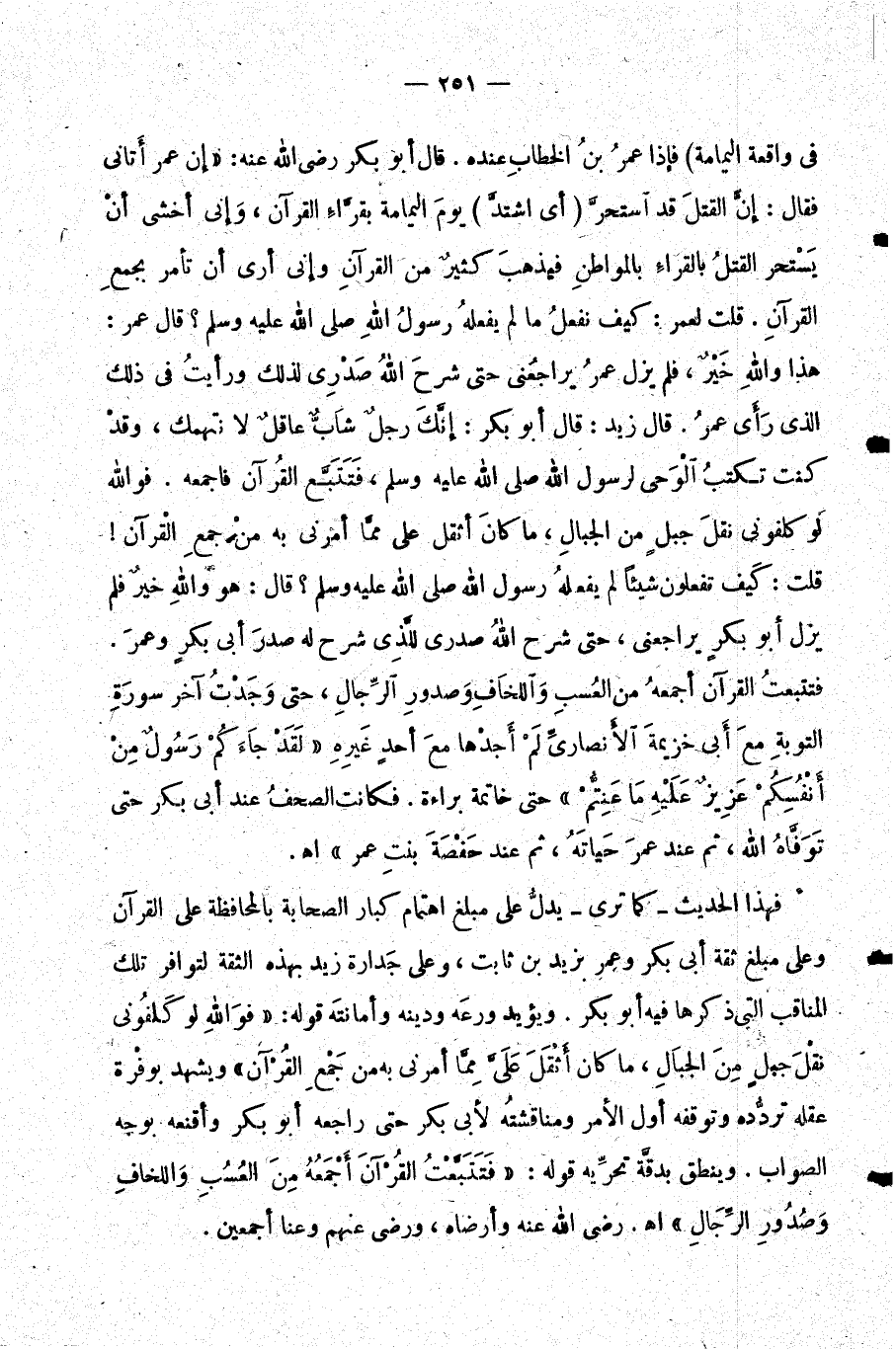 في واقعة اليمامة فإذا عمر بن الخطاب عنده. قال أبو بكر رضي الله عنه: إن عمر أتاني فقال: إن القتل قد أستحر أي اشتد يوم اليمامة بقراء القرآن وإني أخشى أن يستحر القتل بالقراء بالمواطن فيذهب كثير من القرآن وإني أرى أن تأمر بجمع القرآن. قلت لعمر: كيف نفعل ما لم يفعله رسول الله صلى الله عليه وسلم؟ قال عمر: هذا والله خير فلم يزل عمر يراجعني حتى شرح الله صدري لذلك ورأيت في ذلك الذي رأى عمر. قال زيد: قال أبو بكر: إنك رجل شاب عاقل لا نتهمك وقد كنت تكتب الوحي لرسول الله صلى الله عليه وسلم فتتبع القرآن فاجمعه. فوالله لو كلفوني نقل جبل من الجبال ما كان أثقل علي مما أمرني به من جمع القرآن قلت: كيف تفعلون شيئا لم يفعله رسول الله صلى الله عليه وسلم؟ قال: هو والله خير فلم يزل أبو بكر يراجعني حتى شرح الله صدري للذي شرح له صدر أبي بكر وعمر. فتتبعت القرآن أجمعه من العسب واللخاف وصدور الرجال حتى وجدت آخر سورة التوبة مع أبي خزيمة الأنصاري لم أجدها مع أحد غيره {لَقَدْ جَاءَكُمْ رَسُولٌ مِنْ أَنْفُسِكُمْ عَزِيزٌ عَلَيْهِ مَا عَنِتُّمْ} حتى خاتمة براءة. فكانت الصحف عند أبي بكر حتى توفاه الله ثم عند عمر حياته ثم عند حفصة بنت عمر اهـ.