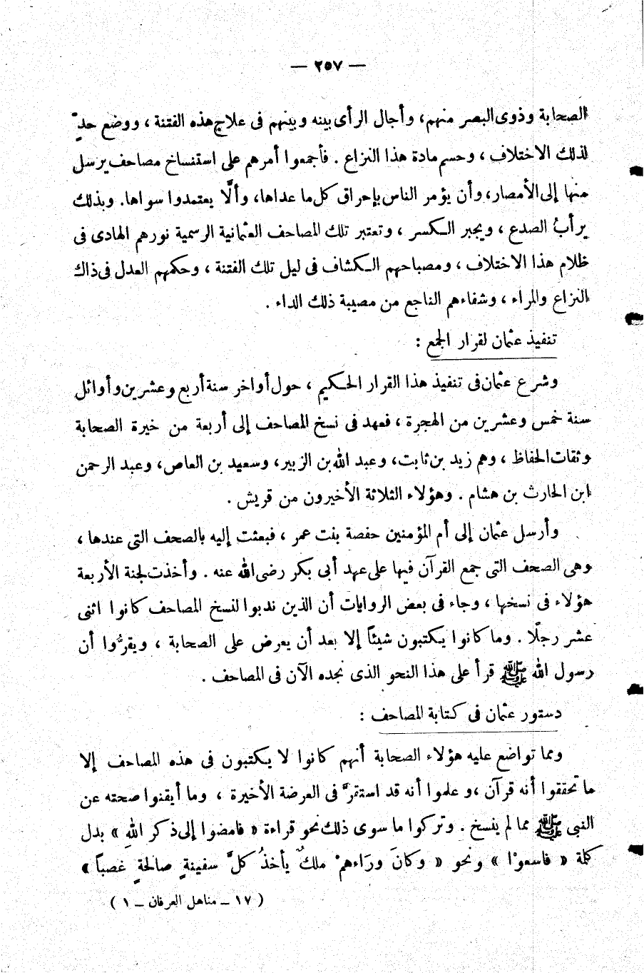 الصحابة وذوي البصر منهم وأجال الرأي بينه وبينهم في علاج هذه الفتنة ووضع حد لذلك الاختلاف وحسم مادة هذا النزاع. فأجمعوا أمرهم على استنساخ مصاحف يرسل منها إلى الأمصار وأن يؤمر الناس بإحراق كل ما عداها وألا يعتمدوا سواها. وبذلك يرأب الصدع ويجبر الكسر وتعتبر تلك المصاحف العثمانية الرسمية نورهم الهادي في ظلام هذا الإختلاف ومصباحهم الكشاف في ليل تلك الفتنة وحكمهم العدل في ذاك النزاع والمراء وشفاءهم الناجع من مصيبة ذلك الداء.