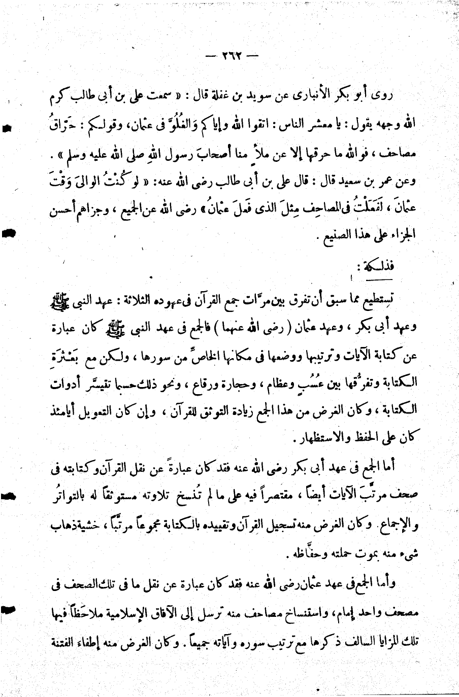 روى أبو بكر الأنباري عن سويد بن غفلة قال: سمعت علي بن أبي طالب كرم الله وجهه يقول: "يا معشر الناس: اتقوا الله وإياكم والغلو في عثمان وقولكم: حراق مصاحف فوالله ما حرقها إلا عن ملأ منا أصحاب رسول الله صلى الله عليه وسلم".