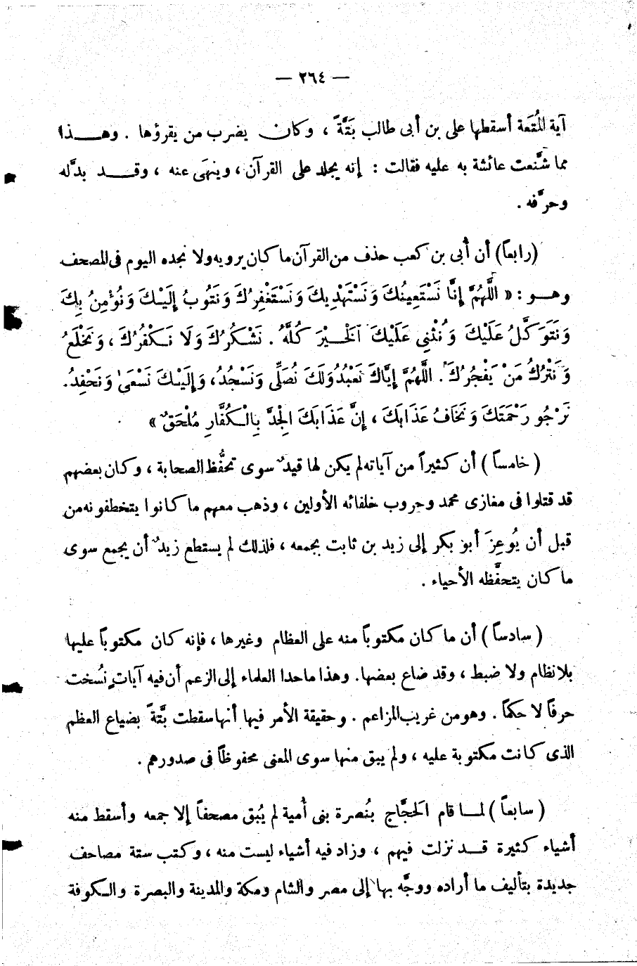 سابعا: لما قام الحجاج بنصرة بني أمية لم يبق مصحفا إلا جمعه وأسقط منه أشياء كثيرة قد نزلت فيهم وزاد فيه أشياء ليست منه وكتب ستة مصاحف جديدة بتأليف ما أراده ووجه بها إلى مصر والشام ومكة والمدينة والبصرة والكوفة