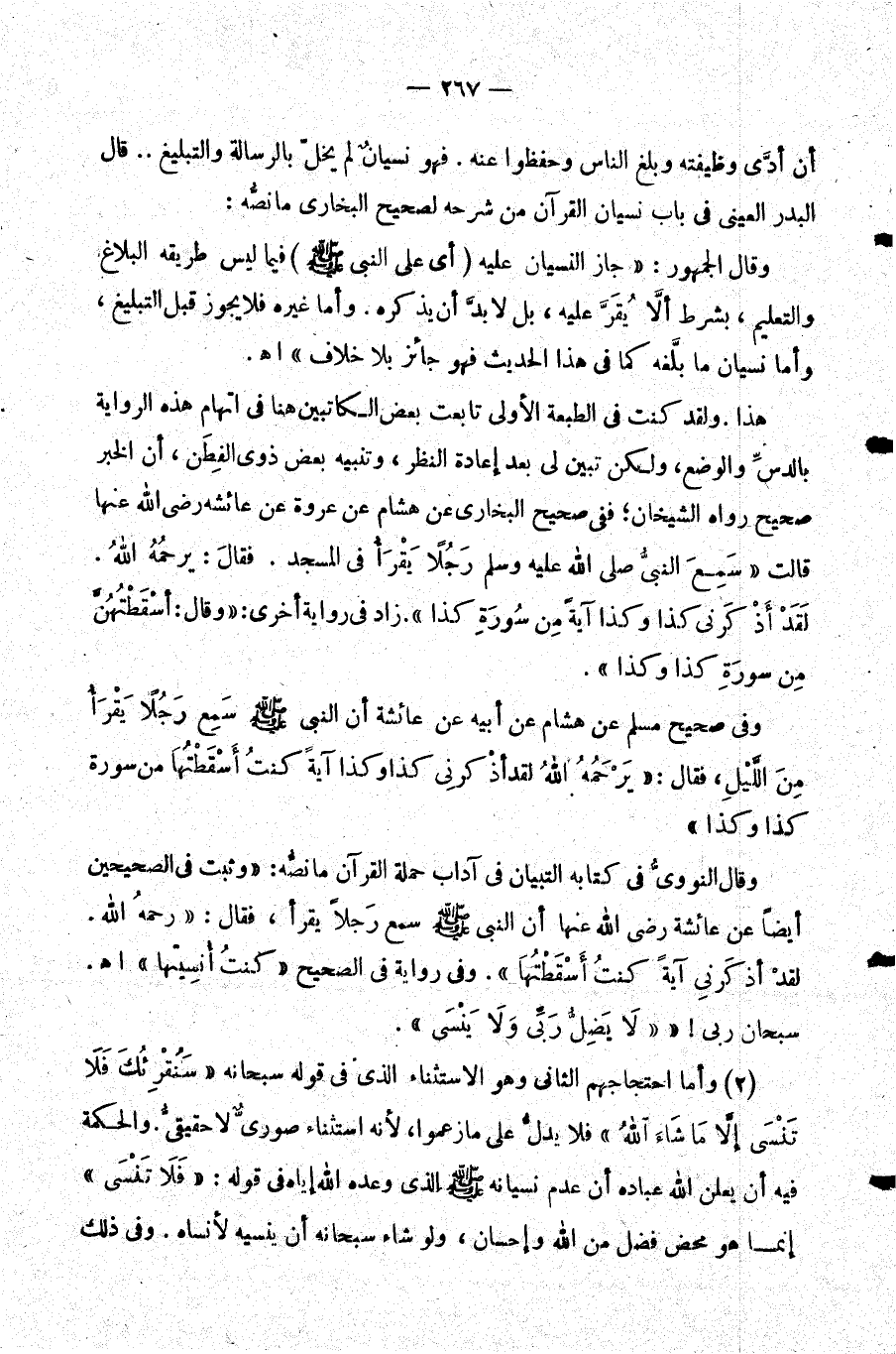 2- وأما احتجاجهم الثاني وهو الاسثناء الذي في قوله سبحانه: {سَنُقْرِئُكَ فَلا تَنْسَى إِلَّا مَا شَاءَ اللَّهُ} فلا يدل على ما زعموا لأنه استثناء صوري لا حقيقي. والحكمة فيه أن يعلن الله عباده أن عدم نسيانه صلى الله عليه وسلم الذي وعده الله إياه في قوله: {فَلا تَنْسَى} إنما هو محض فضل من الله وإحسان ولو شاء سبحانه أن ينسيه لأنساه. وفي ذلك
