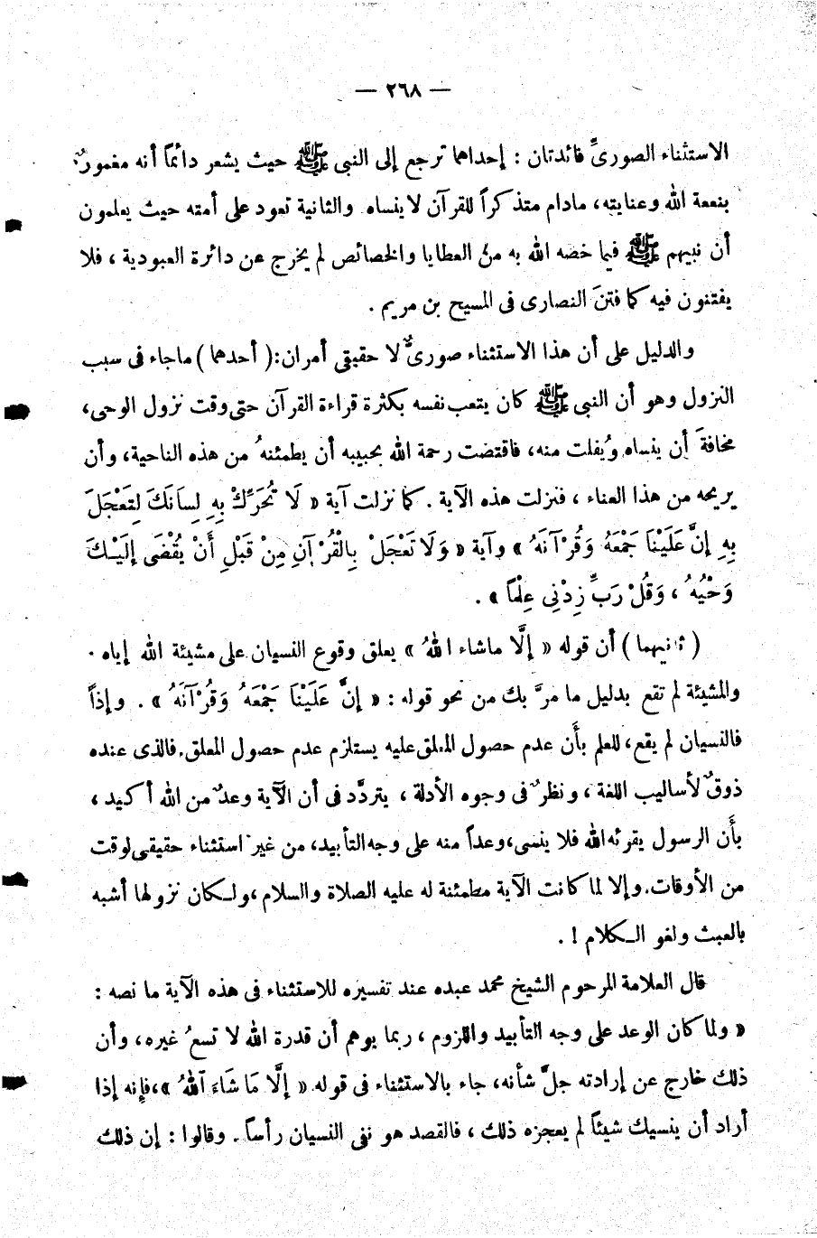 قال العلامة المرحوم الشيخ محمد عبده عند تفسيره للاستثناء في هذه الآية ما نصه: ولما كان الوعد على وجه التأبيد واللزوم ربما يوهم أن قدرة الله لا تسع غيره وأن ذلك خارج عن إرادته جل شأنه جاء بالاستثناء في قوله: {إِلَّا مَا شَاءَ اللَّهُ} فإنه إذا أراد أن ينسيك شيئا لم يعجزه ذلك فالقصد هو نفي النسيان رأسا. وقالوا: إن ذلك