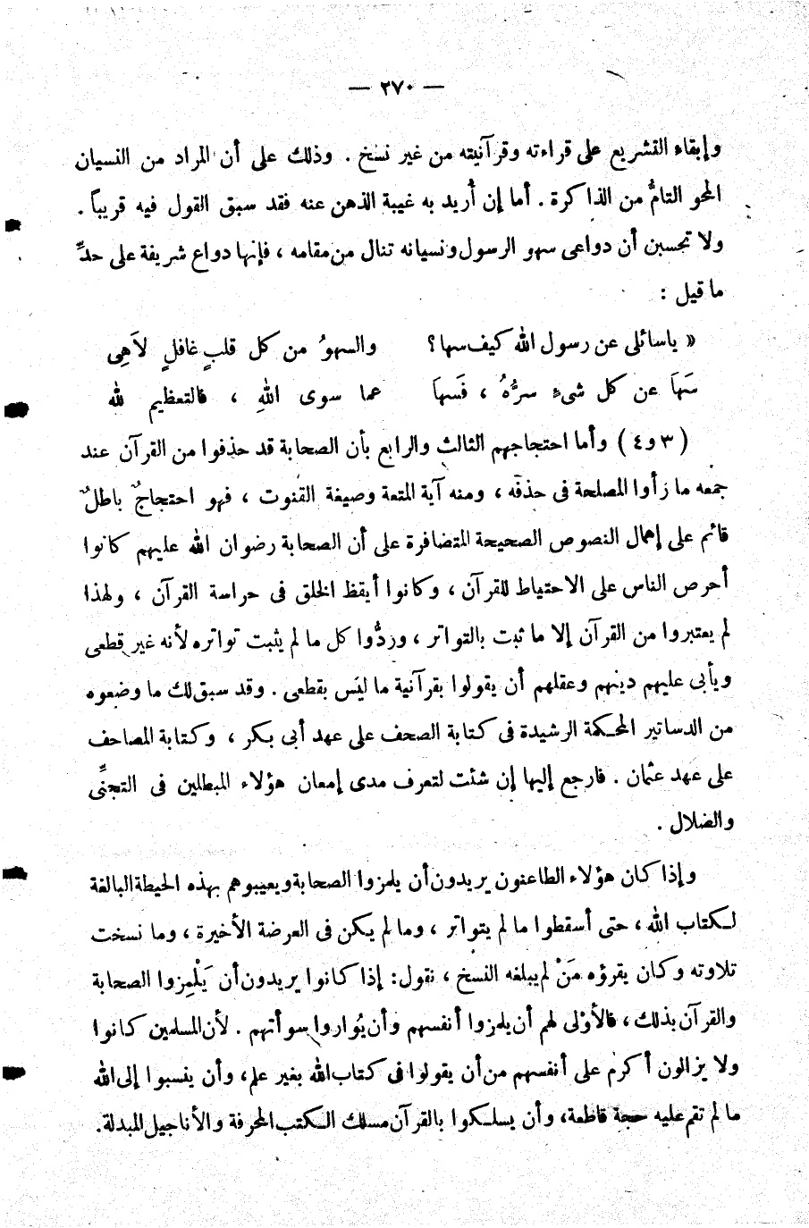 4,3- وأما احتجاجهم الثالث والرابع بأن الصحابة قد حذفوا من القرآن عند جمعه ما رأوا المصلحة في حذفه ومنه آية المتعة وصيغة القنوت فهو احتجاج باطل قائم على إهمال النصوص الصحيحة المتضافرة على أن الصحابة رضوان الله عليهم كانوا أحرص الناس على الاحتياط للقرآن وكانوا أيقظ الخلق في حراسة القرآن ولهذا لم يعتبروا من القرآن إلا ما ثبت بالتواتر وردوا كل ما لم يثبت تواتره لأنه غير قطعي ويأبى عليهم دينهم وعقلهم أن يقولوا بقرآنية ما ليس بقطعي. وقد سبق لك ما وضعوه من الدساتير المحكمة الرشيدة في كتابة الصحف على عهد أبي بكر وكتابة المصاحف على عهد عثمان. فارجع إليها إن شئت لتعرف مدى إمعان هؤلاء المبطلين في التجني والضلال.