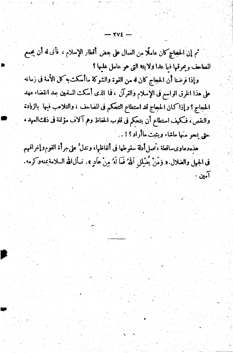وإذا فرضنا أن الحجاج كان له من القوة والشوكة ما أسكت به كل الأمة في زمانه على هذا الخرق الواسع في الإسلام والقرآن فما الذي أسكت المسلمين بعد انقضاء عهد الحجاج؟ وإذا كان الحجاج قد استطاع التحكم في المصاحف والتلاعب فيها بالزيادة والنقص فكيف استطاع أن يتحكم في قلوب الحفاظ وهم آلاف مؤلفة في ذلك العهد حتى يمحو منها ما شاء ويثبت ما أراد؟.