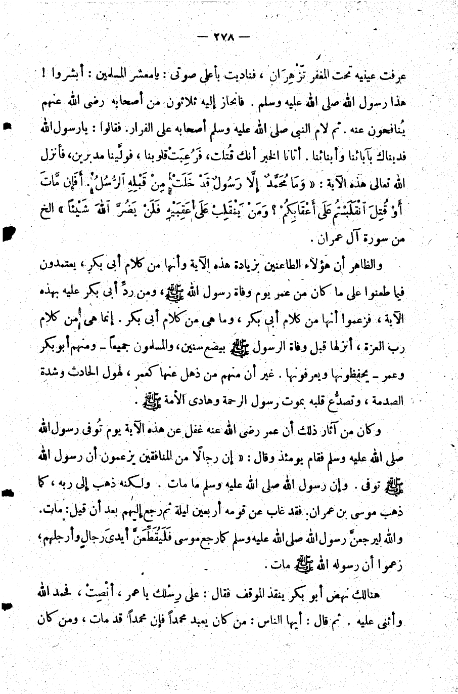 والظاهر أن هؤلاء الطاعنين بزيادة هذه الآية وأنها من كلام أبي بكر يعتمدون فيما طعنوا على ما كان من عمر يوم وفاة رسول الله صلى الله عليه وسلم ومن رد أبي بكر عليه بهذه الآية فزعموا أنها من كلام أبي بكر وما هي من كلام أبي بكر. إنما هي من كلام رب العزة أنزلها قبل وفاة الرسول صلى الله عليه وسلم ببضع سنين والمسلمون جميعا ومنهم أبو بكر وعمر يحفظونها ويعرفونها. غير أن منهم من ذهب عنها كعمر لهول الحادث وشدة الصدمة وتصدع قلبه بموت رسول الرحمة وهادي الأمة صلى الله عليه وسلم.