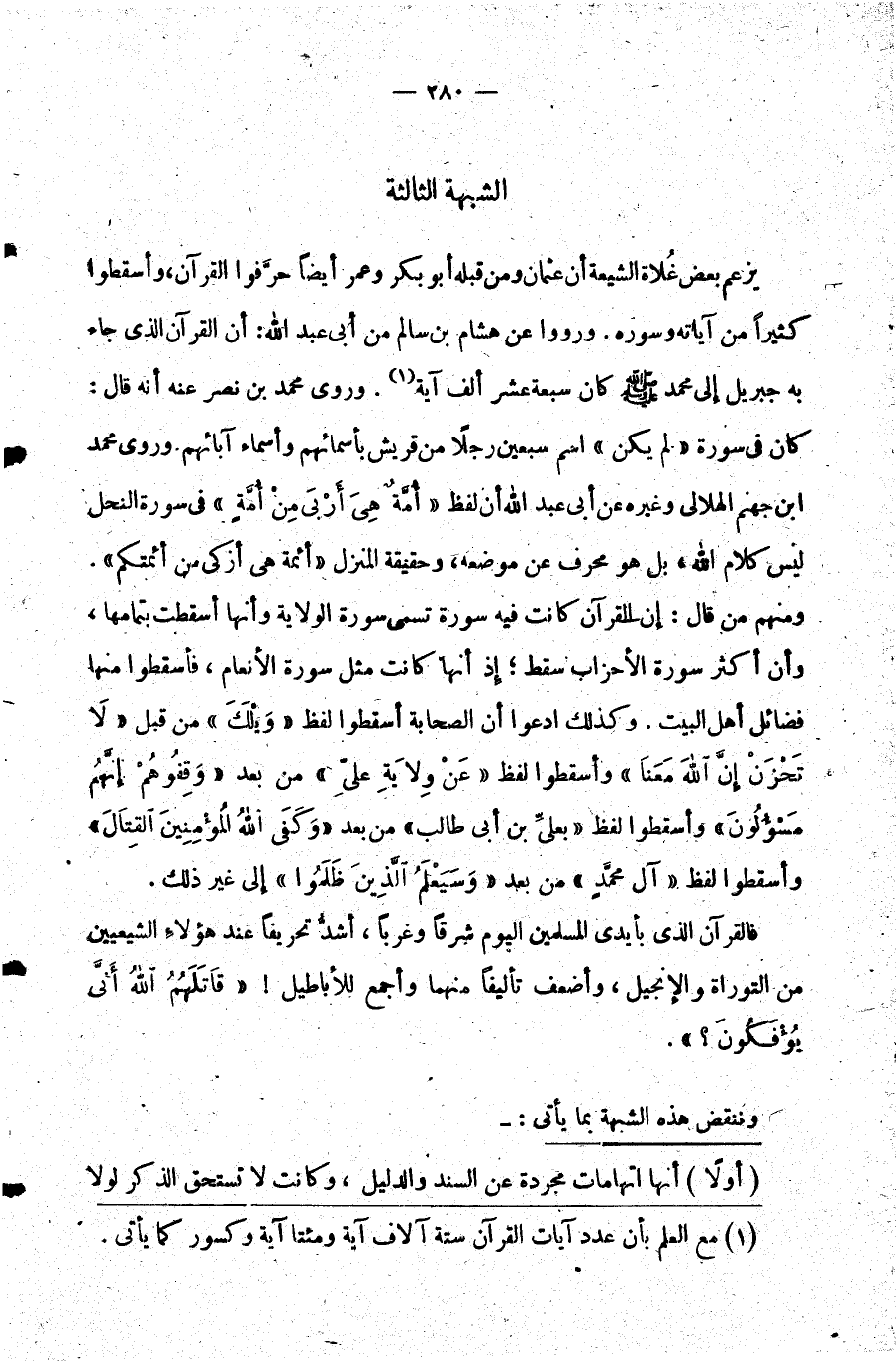 فالقرآن الذي بأيدي المسلمين اليوم شرقا وغربا أشد تحريفا عند هؤلاء الشيعيين من التوراة والإنجيل وأضعف تأليفا منهما وأجمع للأباطيل {قَاتَلَهُمُ اللَّهُ أَنَّى يُؤْفَكُونَ} ؟.