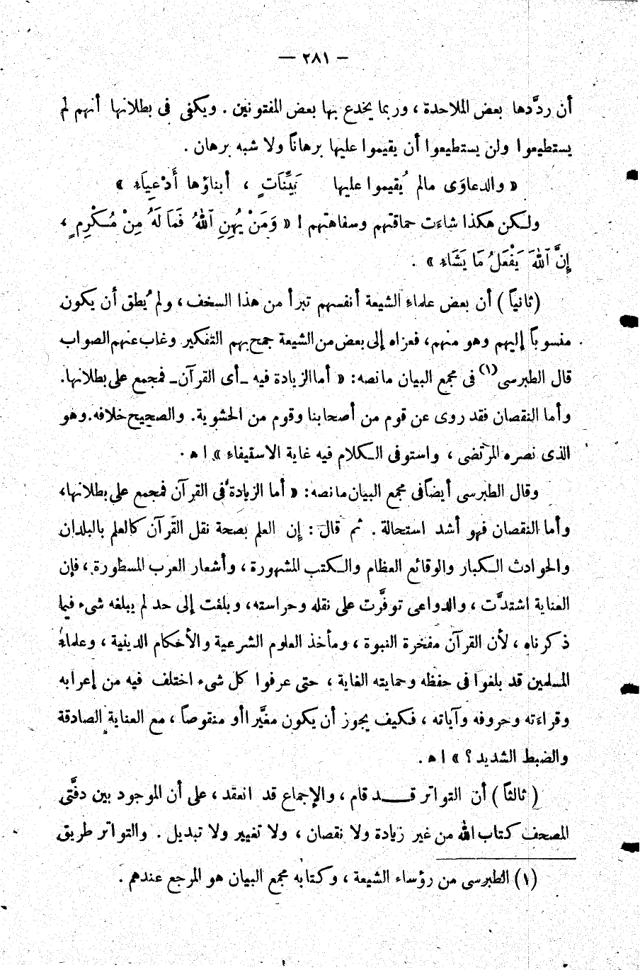 وقال الطبرسي أيضا في مجمع البيان ما نصه: أما الزيادة في القرآن فمجمع على بطلانها وأما النقصان فهو أشد استحالة. ثم قال: إن العلم بصحة نقل القرآن كالعلم بالبلدان والحوادث الكبار والوقائع العظام والكتب المشهورة وأشعار العرب المسطورة فإن العناية اشتدت والدواعي توفرت على نقله وحراسته وبلغت إلى حد لم يبلغه شيء فيما ذكرناه لأن القرآن مفخرة النبوة ومأخذ العلوم الشرعية والأحكام الدينية وعلماء المسلمين قد بلغوا في حفظه وحمايته الغاية حتى عرفوا كل شيء اختلف فيه من إعرابه وقراءته وحروفه وآياته فكيف يجوز أن يكون مغيرا أو منقوصا مع العناية الصادقة والضبط الشديد؟ اهـ.