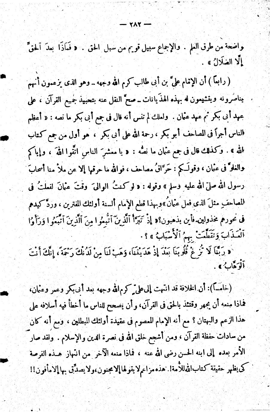خامسا: أن الخلافة قد انتهت إلى علي كرم الله وجهه بعد أبي بكر وعمر وعثمان فماذا منعه أن يجهر وقتئذ بالحق في القرآن وأن يصحح للناس ما أخطأ فيه أسلافه على هذا الزعم والبهتان؟ مع أنه الإمام المعصوم في عقيدة أولئك المبطلين ومع أنه كان من سادات حفظة القرآن ومن أشجع خلق الله في نصرة الدين والإسلام.