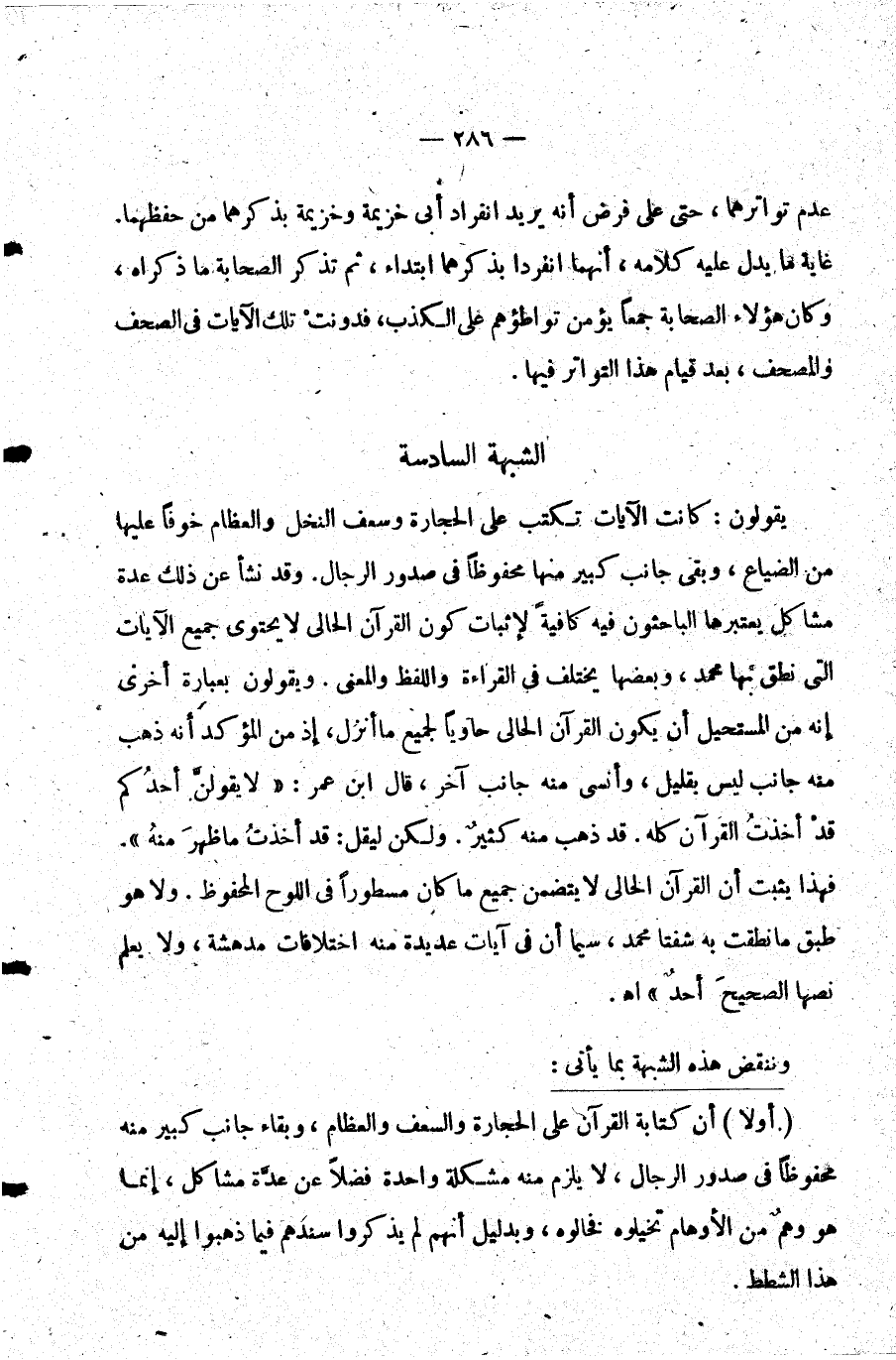 أولا: أن كتابة القرآن على الحجارة والسعف والعظام وبقاء جانب كبير منه محفوظا في صدور الرجال لا يلزم منه مشكلة واحدة فضلا عن عدة مشاكل إنما هو وهم من الأوهام تخيلوه فخالوه وبدليل أنهم لم يذكروا سندهم فيما ذهبوا إليه من هذا الشطط.