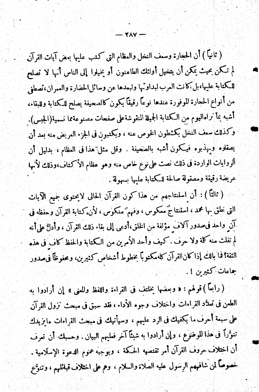 ثانيا: أن الحجارة وسعف النخل والعظام التي كتب عليها بعض آيات القرآن لم تكن بحيث يمكن أن يتخيل أولئك الطاعنون أو يخيلوا إلى الناس أنها لا تصلح للكتابة عليها بل كانت العرب لبداوتها ولبعدها عن وسائل الحضارة والعمران تصطفي من أنواع الحجارة الموفورة عندها نوعا رقيقا يكون كالصحيفة يصلح للكتابة وللبقاء أشبه بما نراه اليوم من الكتابة الجميلة المنقوشة على صفحات مصنوعة مما نسميه الجبس.